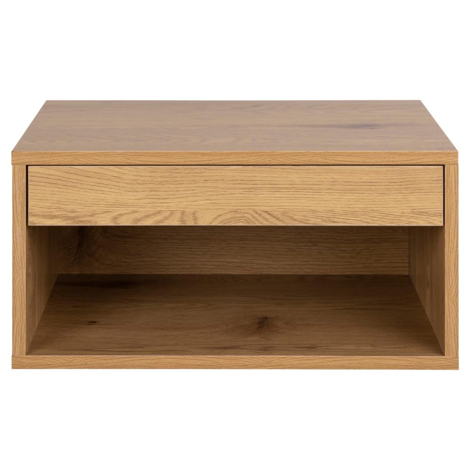 Ett praktiskt, men ändå attraktivt väggmonterat sängbord, prytt med ett utseende av vild ek, som smälter sömlöst med modern sovrumsinredning. Den lättglidande lådan är perfekt för förvaring av dina sängbordstillbehör, medan det öppna facket är idealiskt för böcker eller tidskrifter.