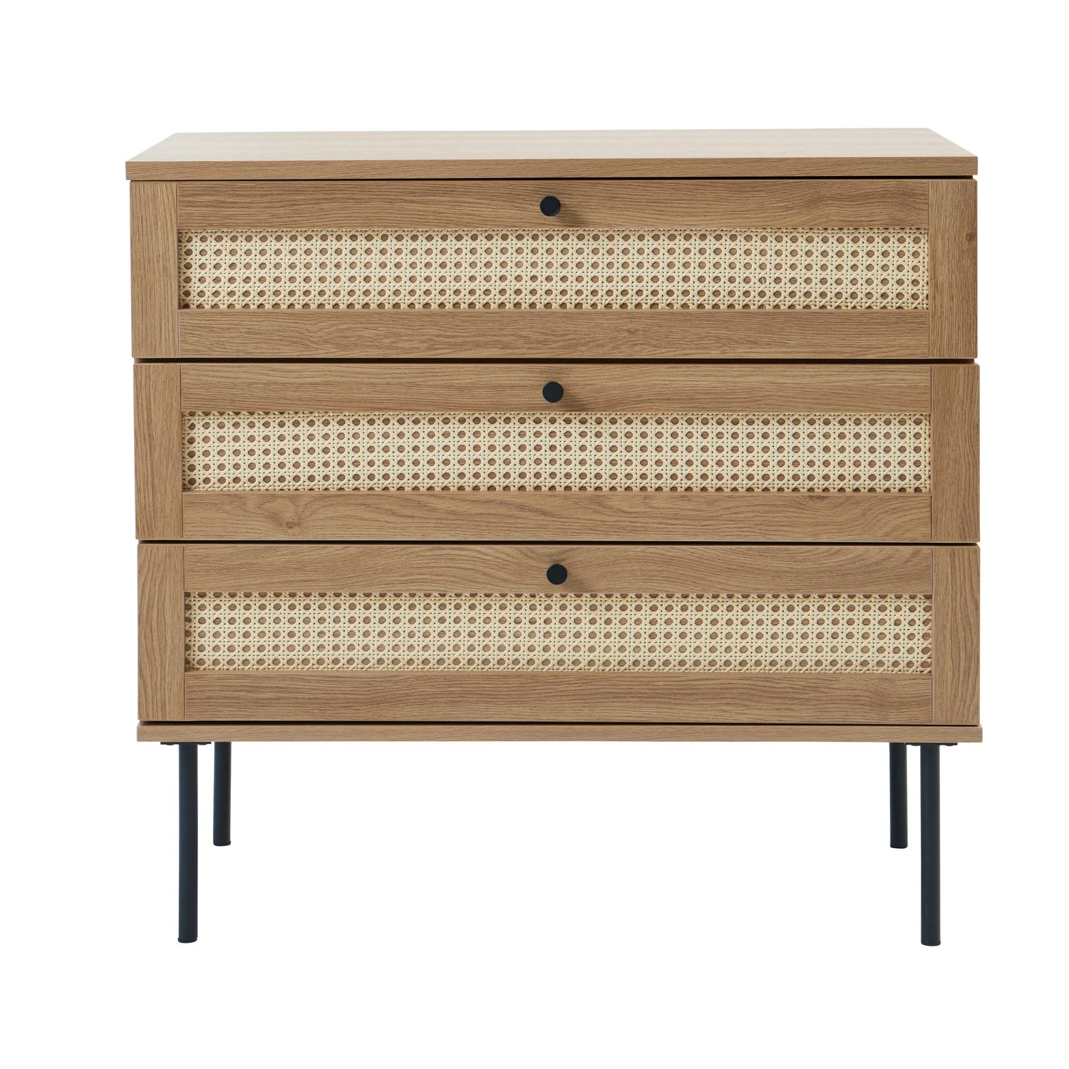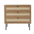 Denna byrå är tillverkad av hållbart trä och har lådor med polyrotting och eleganta svarta metallben. Dess skandinaviska design kombinerar naturliga material med funktionalitet, vilket gör den till ett perfekt tillskott i hemmet.