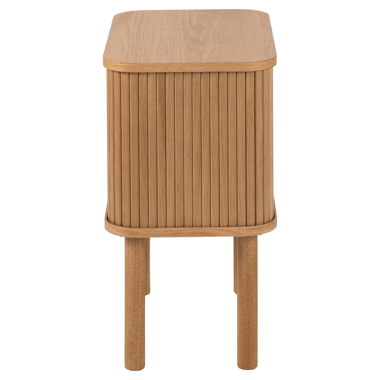 Höj ditt sovrum med detta nattduksbord i trä. Tillverkat i en rektangulär form med runda hörn, förenar bordet modern och naturlig estetik och passar in i olika inredningsstilar. Det är ribbdekoren, den runda karaktären och de lackerade ekdetaljerna som definierar bordets signaturlook.