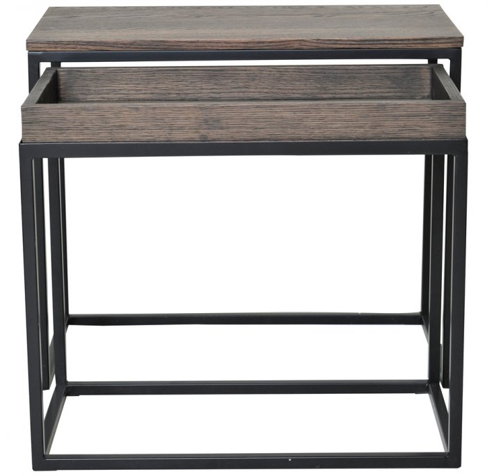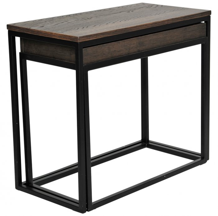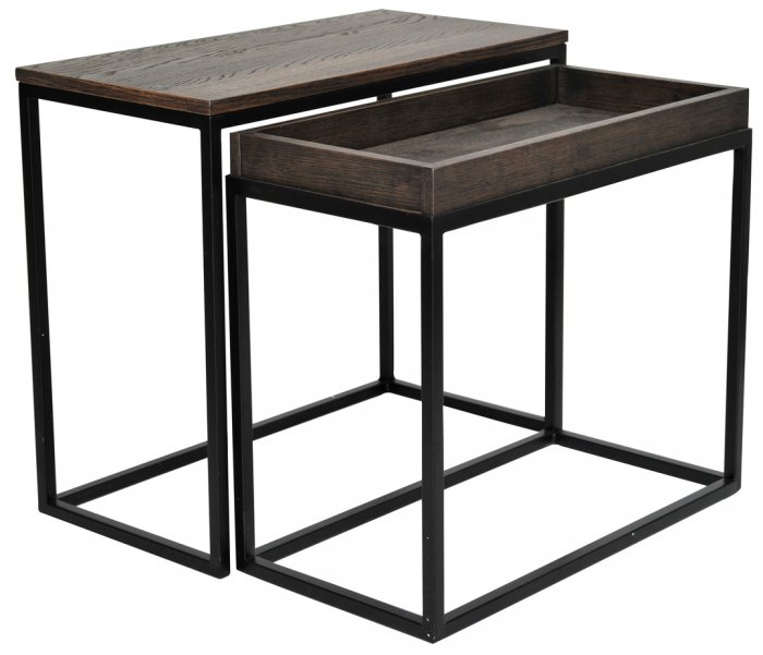 Duett är ett elegant och modernt rektangulärt satsbord från Nordic Furniture Group. Borden har snygga toppskivor i rökbetsad ek och underreden tillverkade i svartlackad metall. I detta set ingår två stycken bord enligt bild. Det mindre bordet är 55x25x52 cm stort.