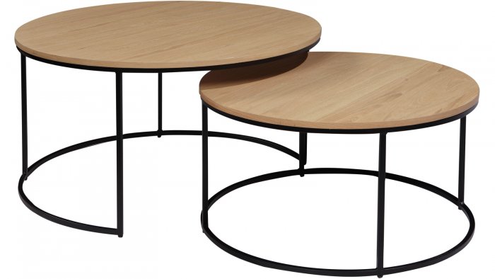 Bordsskivorna är tillverkade i vitpigmenterad ekfanér, vilket ger en ljus och naturlig känsla samtidigt som träets vackra struktur framhävs. Den eleganta ytan kompletteras av svartlackade metallunderreden, som skapar en stilren kontrast och ger borden en stabil och luftig design.