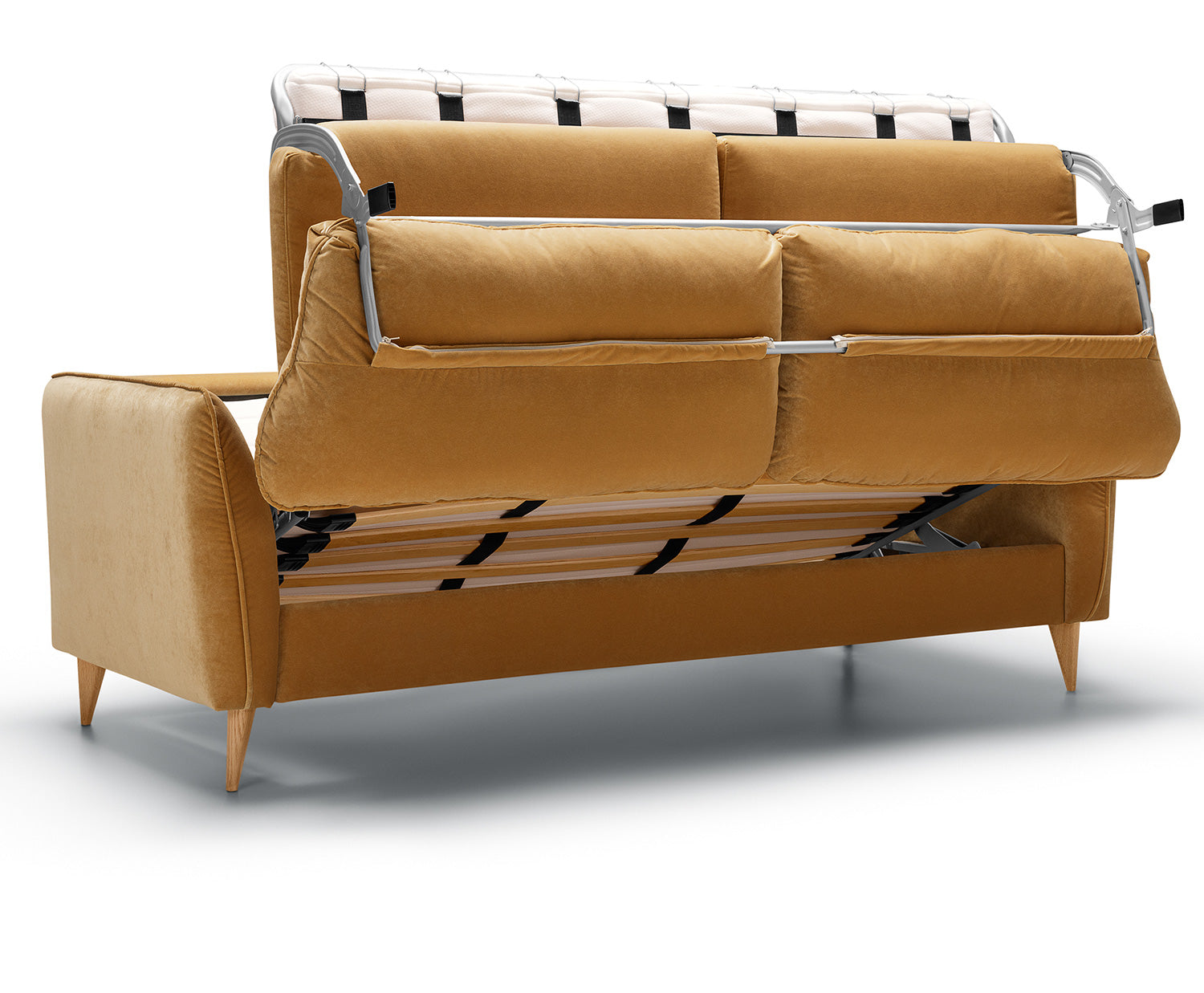 Lucy är en klassiskt designad bäddsoffa med en mycket bra sovfunktion och sittkomfort. Under dagen är Lucy en stabil möbel och genom sin unika mekanism förändras Lucy från en soffa till en säng - enkelt och lätt. Du behöver inte flytta på ryggkuddarna utan dessa fälls in under sängen. Hela sängytan tillsammans med madrassen är på insidan av möbeln. Madrassen i Lucy är en bra och komfortable bonellmadrass.