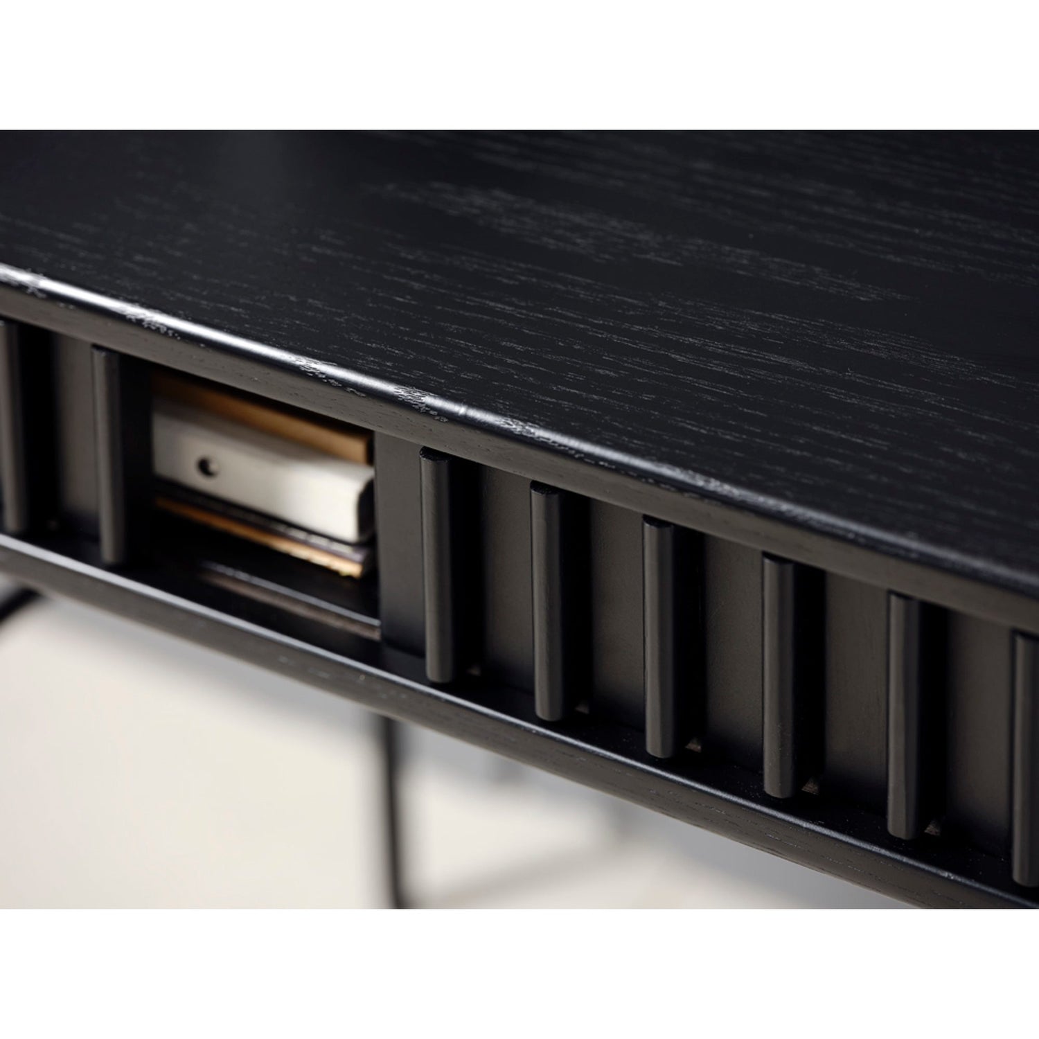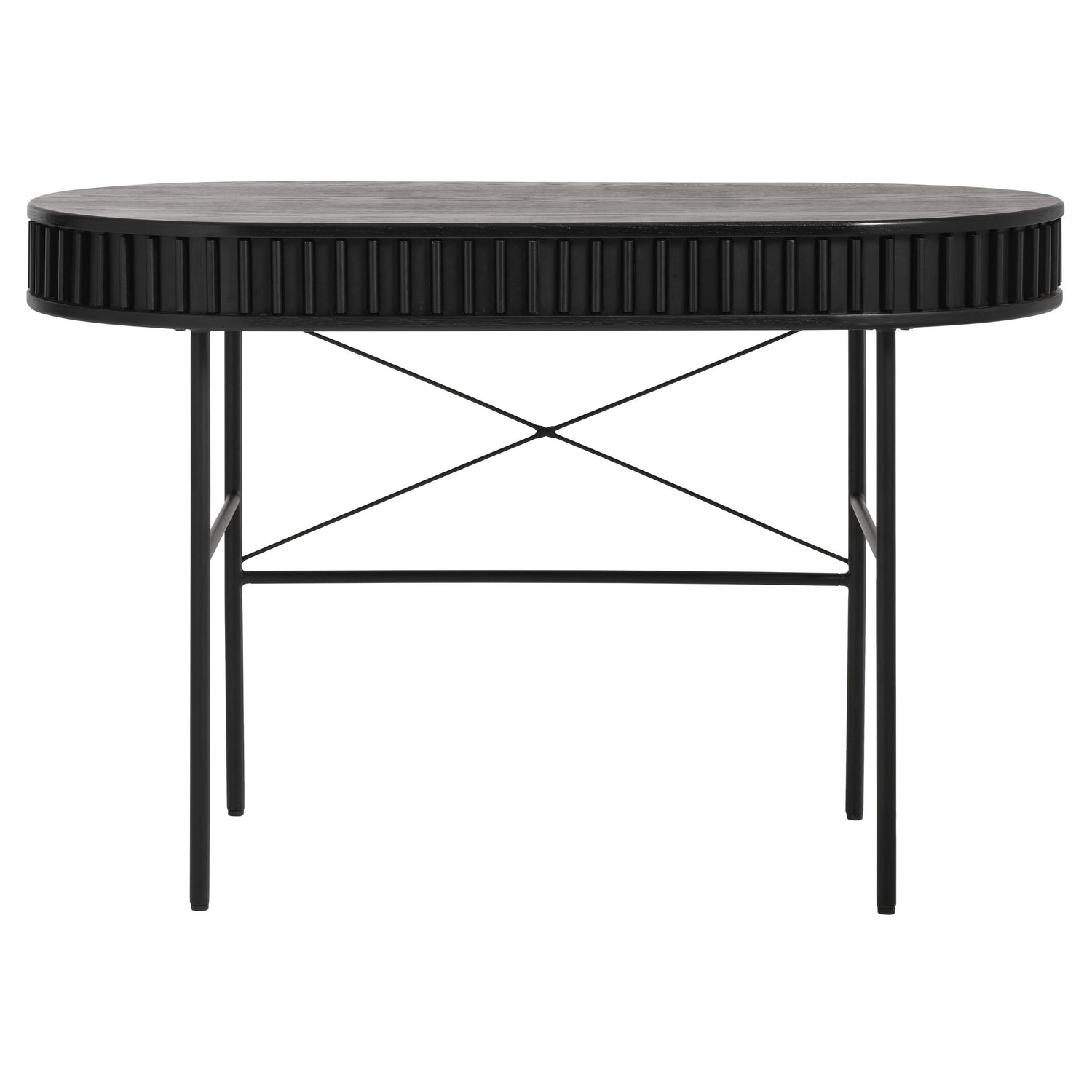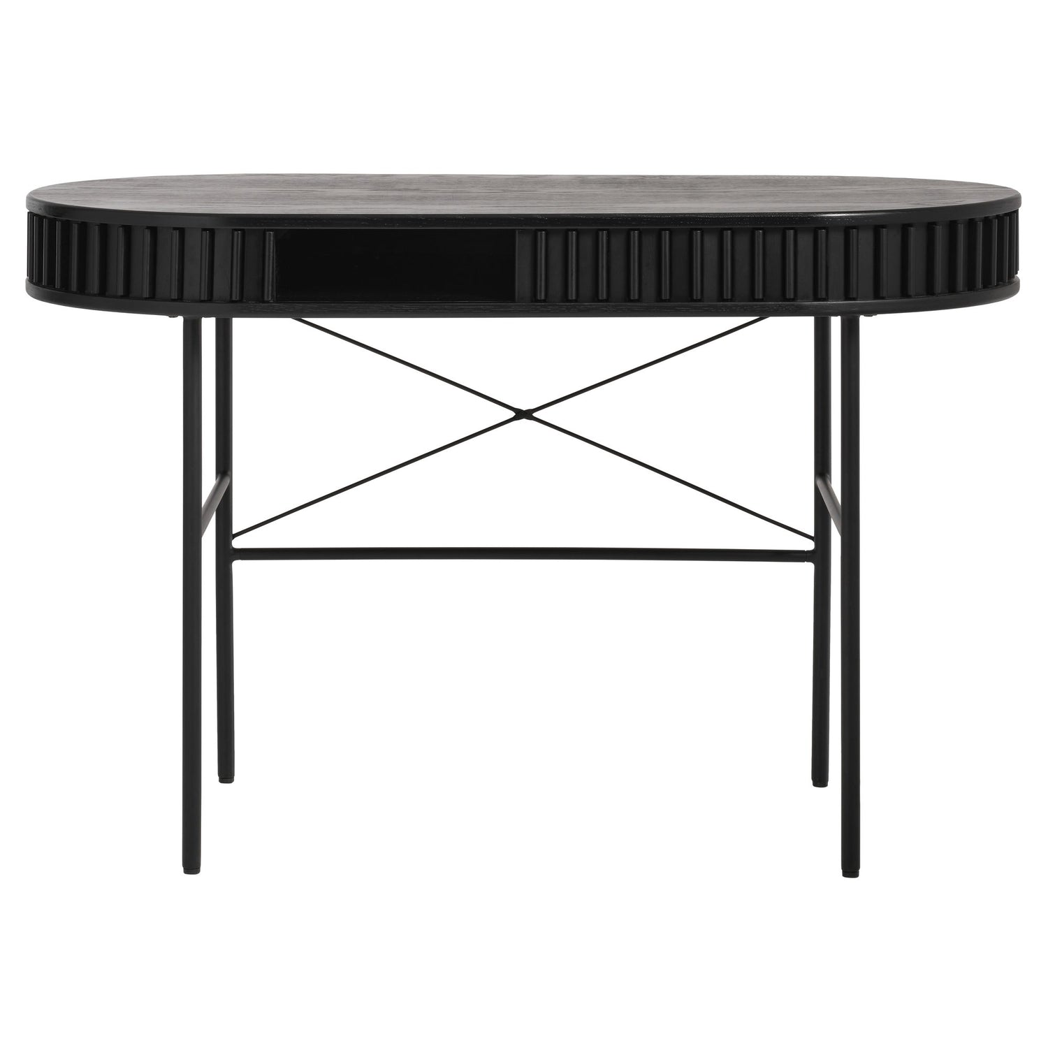 Audrey är skrivbordet som gör hemmakontoret lika stilrent som funktionellt. Den ovala skivan i svartpigmenterat ekfanér ramas in av en diskret räfflad kant som ger ett skulpturalt uttryck utan att ta plats. Det slanka metallstativet med krysstag ger stabilitet och lämnar gott om benutrymme. Med 60 cm djup och 120 cm bredd får du en arbetsyta som rymmer laptop, skärm och anteckningar, perfekt för fokuserat arbete i mindre rum.