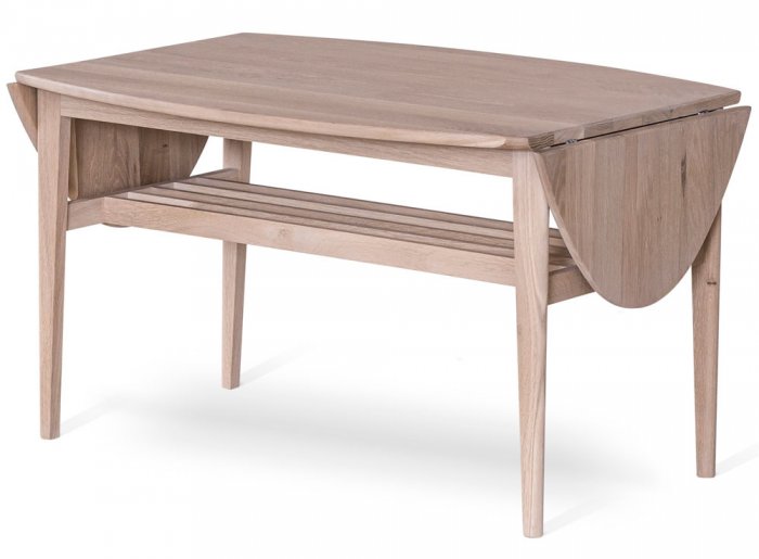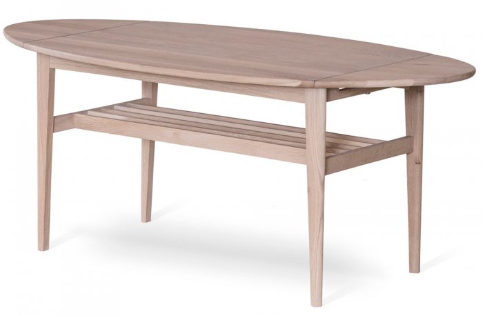 Flip är ett snyggt ovalt soffbord från Torkelson. Flip har med sina smidiga hängklaffar möjligheten att ändra storlek och form. Stommen är tillverkad i vitoljad massiv ek. Bordet har en smidig hylla på undersidan. Flip är ett perfekt soffbord för dig som tycker om modern och klassisk skandinavisk design och vill ha möjlighet att förlänga soffbordet vid t.ex. fester.