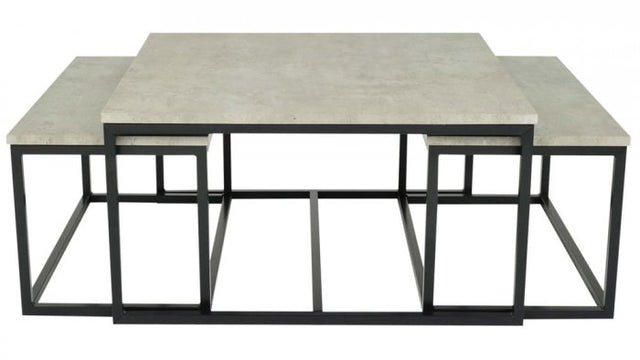 Hertog är ett modernt och stilrent satsbord från Nordic Furniture Group. Bordet har en snygg topp i melamin med en elegant betongimitation. Underede i svartlackad metall. I detta set ingår 3st bord, ett större kvadratiskt med två mindre som du enkelt kan skjuta in under det stora. Tänk på att alltid använda underlägg till dricksglas och annat som kan orsaka märken i bordet.