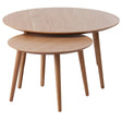 Marilyn är ett set med två runda satsbord i naturlig ekfaner. De rena linjerna och de smäckra benen ger en tidlös, skandinavisk känsla. Använd borden tillsammans för en generös soffyta eller dra isär dem när du vill skapa flera små avställningsplatser. När du behöver golvyta skjuter du snabbt in det mindre bordet under det större.