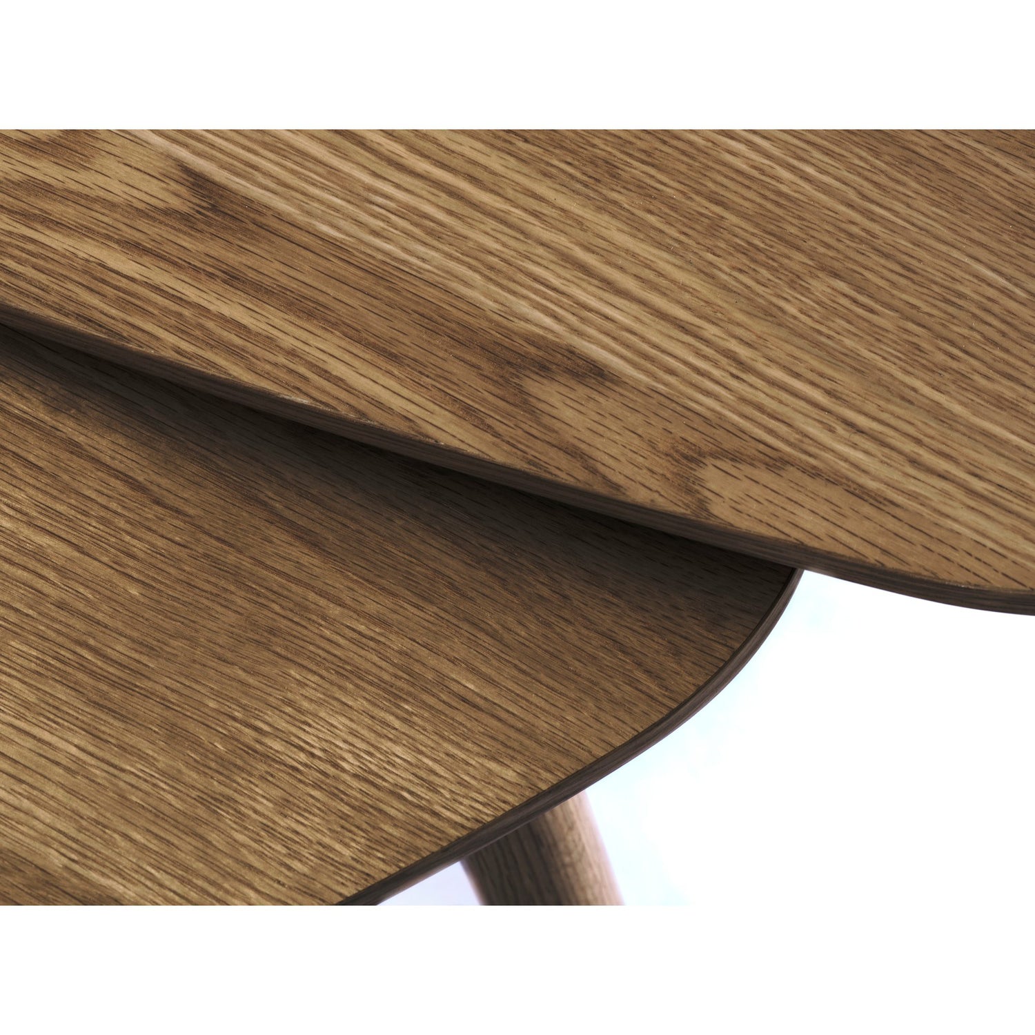 Marilyn Triangel i rökt ekfaner ger rummet en djupare, varm ton. De mjukt avrundade triangelrunda skivorna kan placeras överlappade för ett livfullt uttryck eller delas upp när du vill sprida ut ytorna. Passar lika bra till raka som rundade soffor.