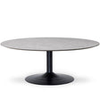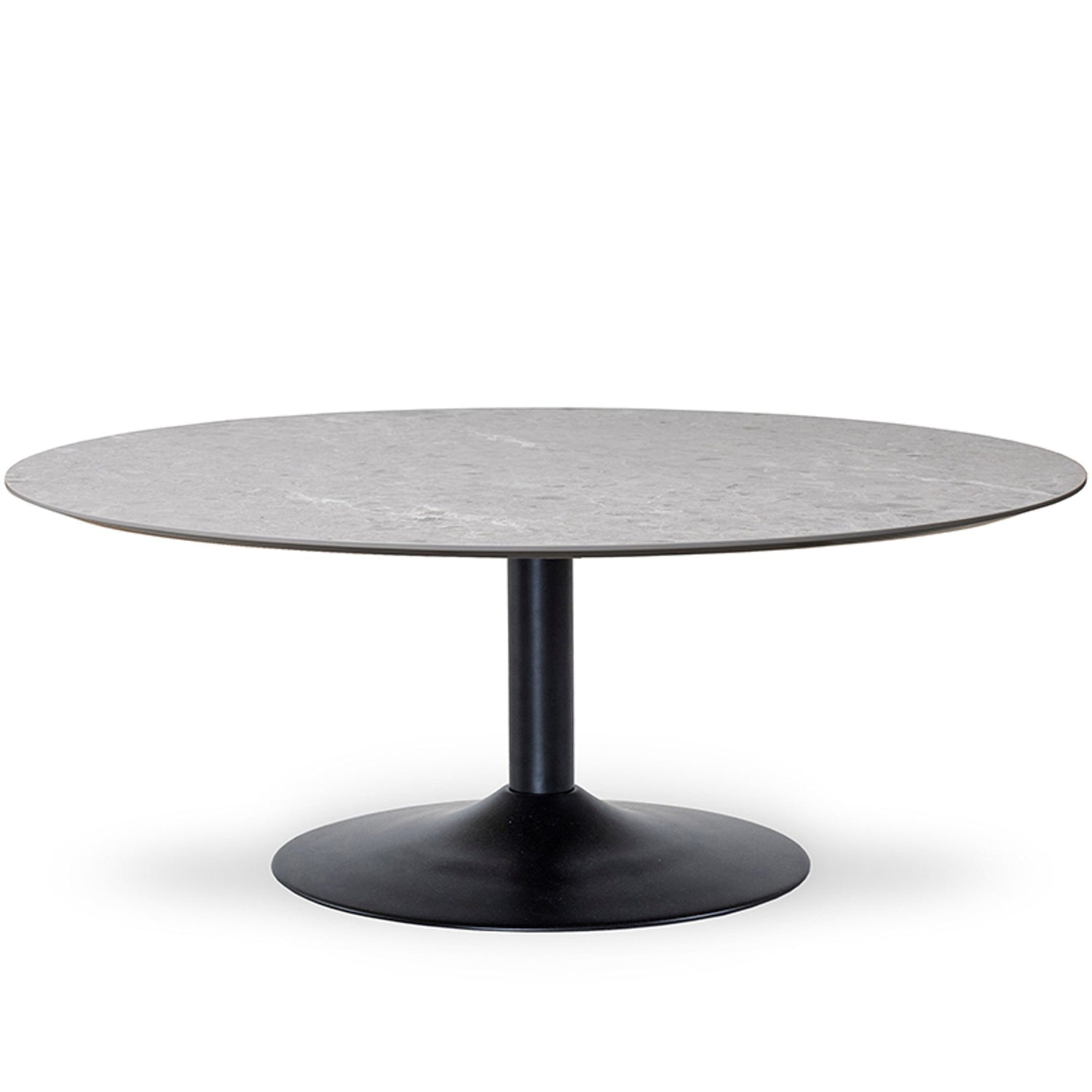 Miles runt soffbord med diameter 110 cm. Bordsskivan är i laminat i sandsten med trumpetfot i pulverlackad svart metall.