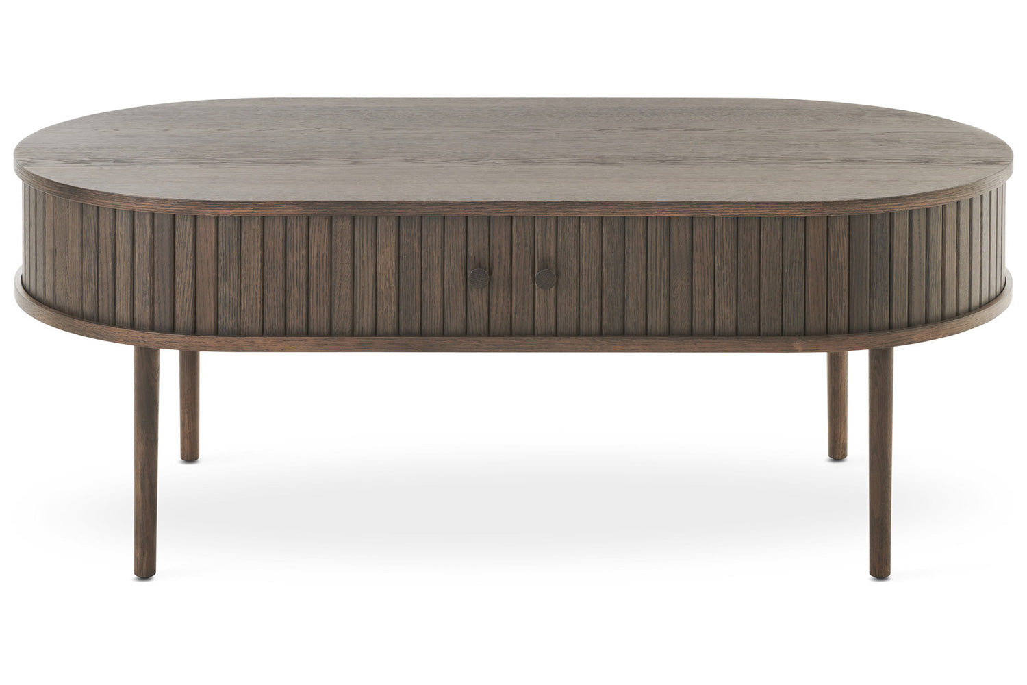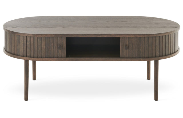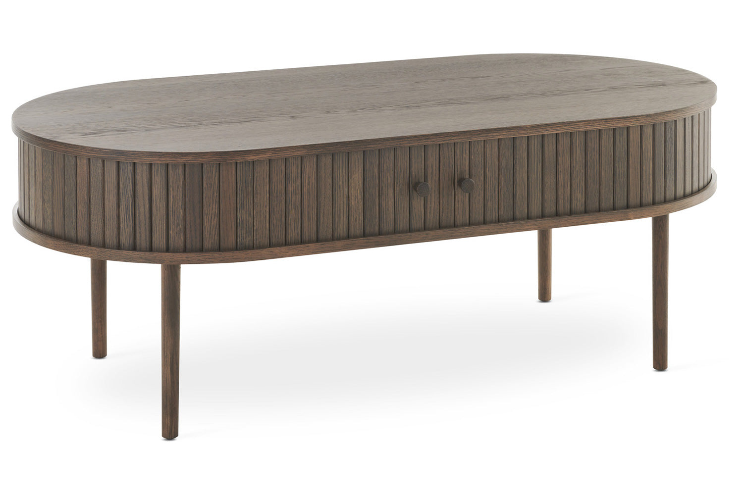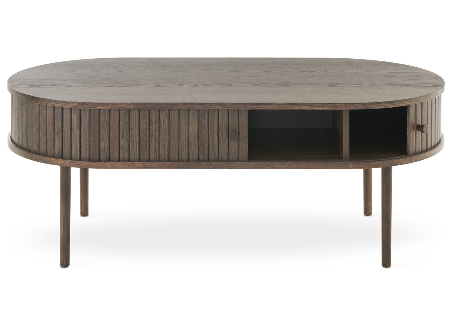 Nilo soffbord från Nestic kombinerar varm träkänsla med smart funktion. Bordet är tillverkat i brunlackad ek med fanér som låter ådringen träda fram och ger en tålig, lättskött yta. Den generöst ovala bordsskivan och de mjukt rundade kanterna ger ett inbjudande uttryck, medan de smäckra benen gör helheten luftig och enkel att placera i både mindre och större vardagsrum.