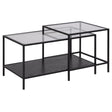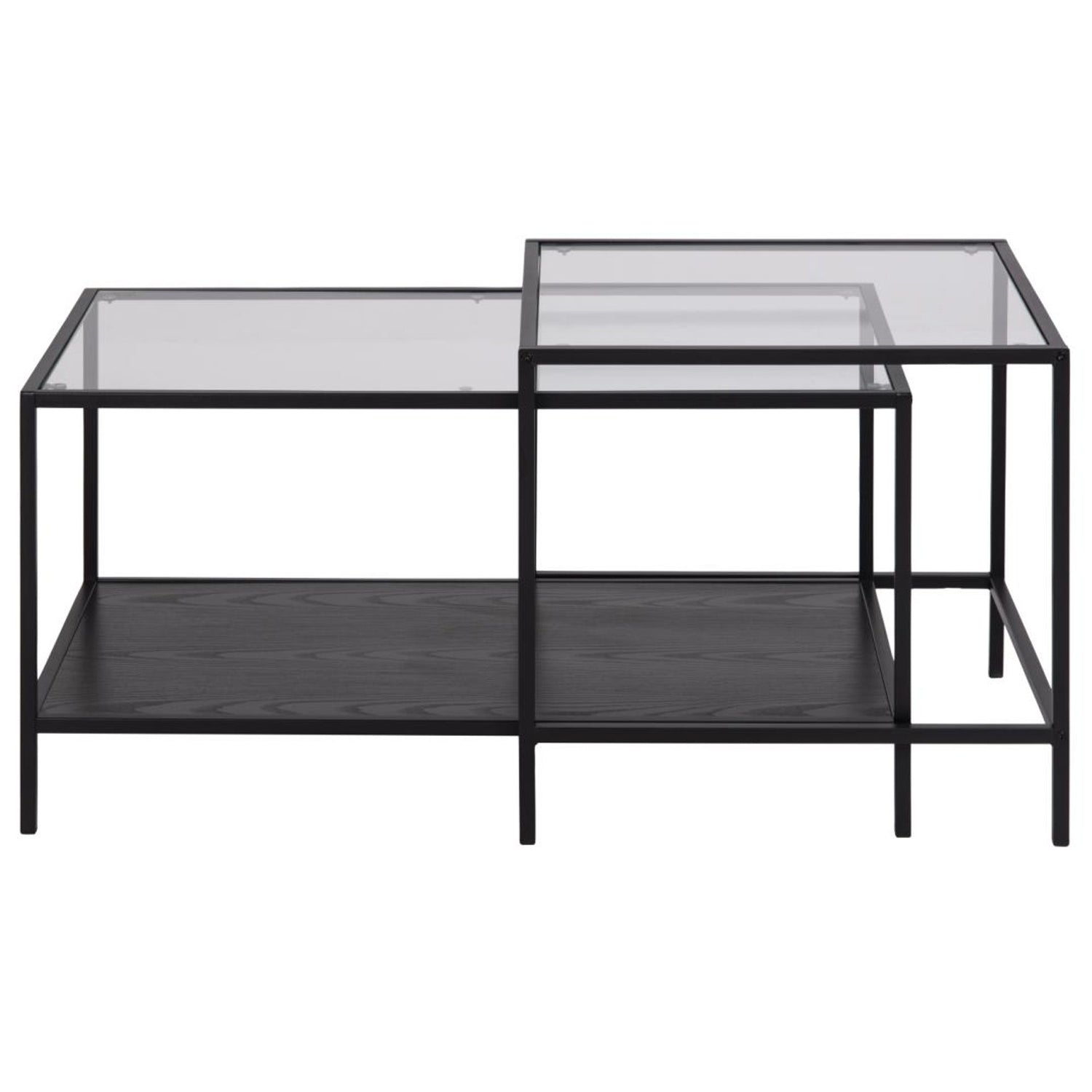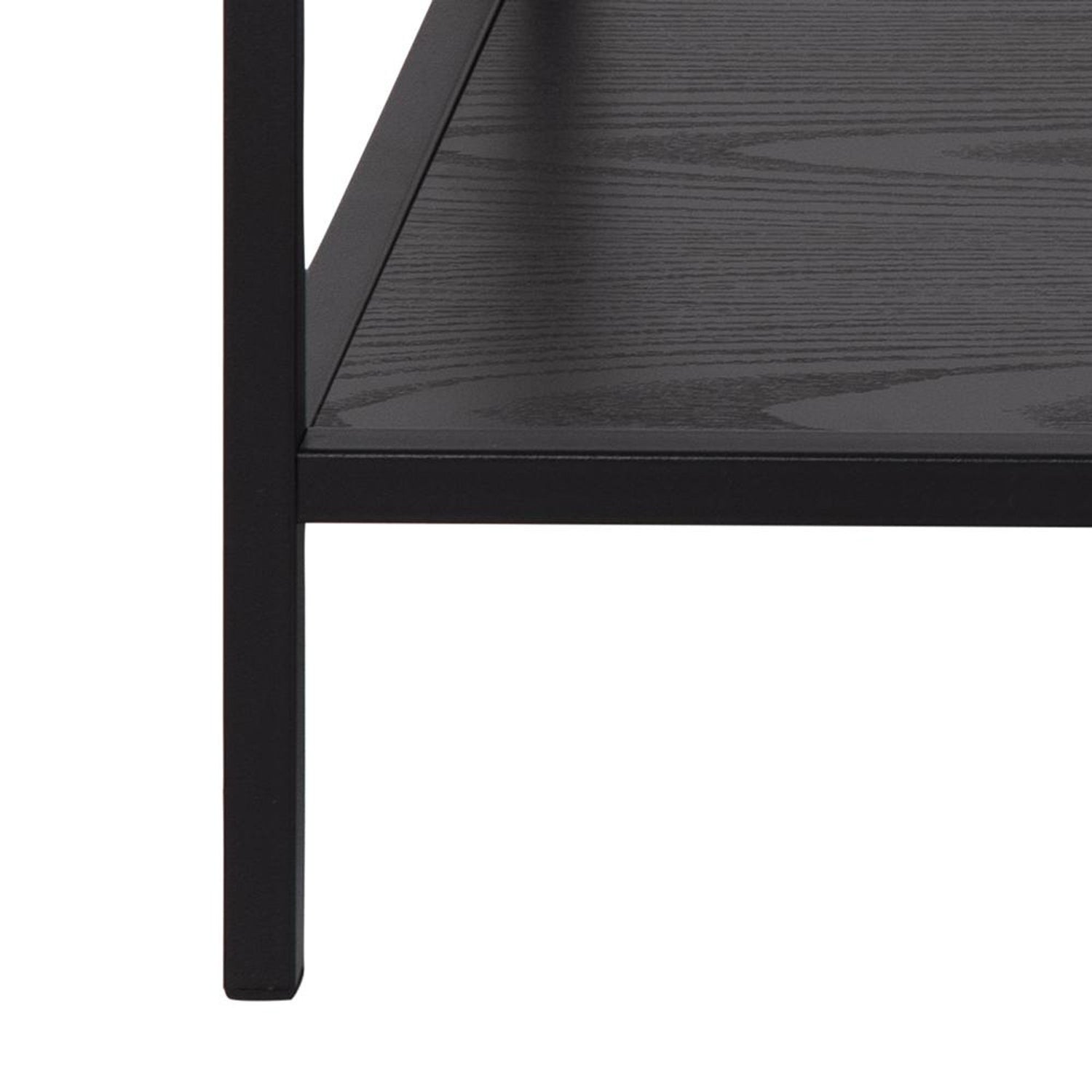 Fullända ditt vardagsrum med detta eleganta soffbord. Glasskivan ger en känsla av lätthet medan de svarta ask-look hyllorna erbjuder smart förvaring. Det passar in med många inredningsstilar och ger en industriell känsla tack vare den pulverlackerade stålramen.