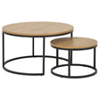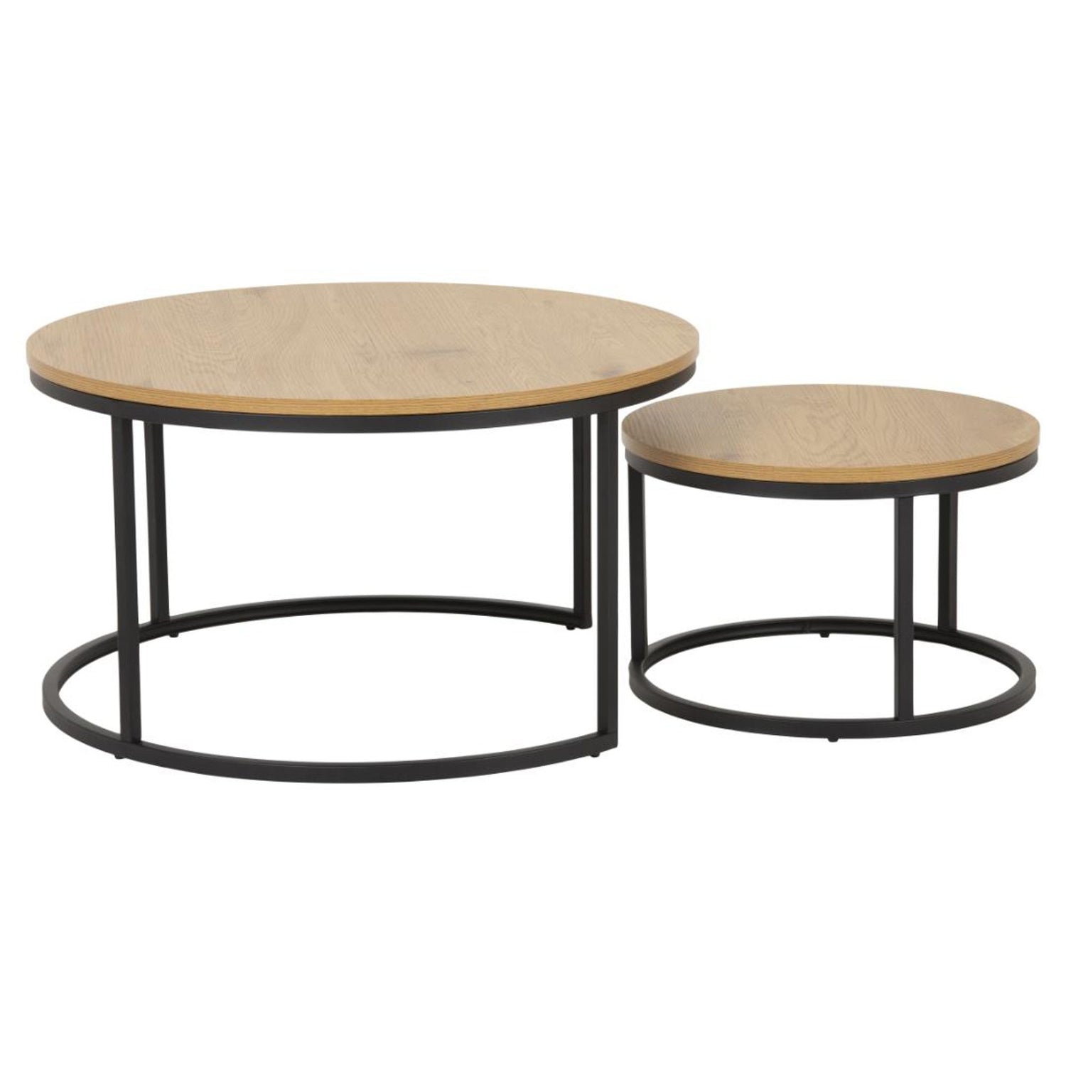 Den runda formen på detta soffbordset ger ett modernt utseende som passar perfekt i de flesta hem. Bordet har en vild ekutseende topp och en svart pulverlackerad stålram som gör det både elegant och hållbart.