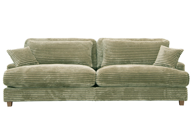Tor är en modern och rymlig loungesoffa i 3,5 sits som bjuder in till riktig avkoppling. Klädseln är Angel Everglad, ett mjukt och fluffigt manchestertyg med bred ribb som fångar ljuset och ger en dämpad grön ton åt det salviagröna hållet. Färgen framhäver soffans generösa former och ger rummet en lugn och ombonad känsla.