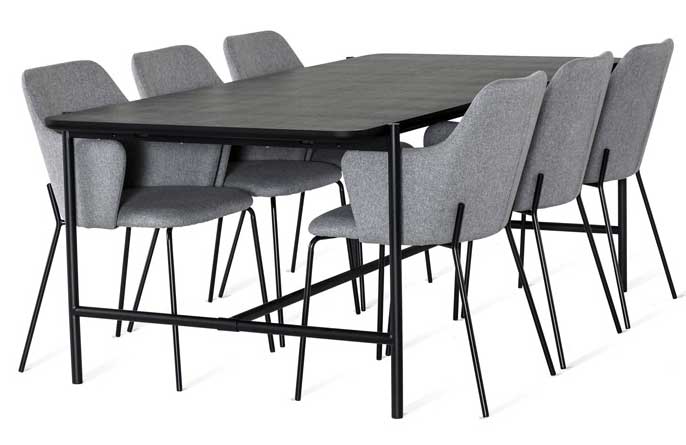 Cane är ett modernt matbord med en nätt design från Torkelson. Toppskivan till Cane är tillverkad i svartbetsad fanérad ek med en mattlackad yta. Det smala och eleganta underredet är tillverkat i svartlackad metall och gör att det stora bordet ändå lämnar luftig känsla. Köpa till upp till två stycken insticksklaffar för att enkelt kunna förlänga bordet. Cane är en serie från Torkelson med flera olika möbler för så du kan skapa ett enhetligt rum. Bordet finns i rektangulärt och runt