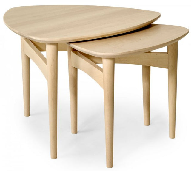 Orust är ett nätt och mysigt litet satsbord från svenska Torkelson. Välj mellan olika finishar och material för att det ska passa ditt rum. Orust har en triangulär form som ger ett nätt och stilrent intryck. I setet ingår två små soffbord där du enkelt kan skjuta in det mindre under det stora. Orust kommer i massiv björk eller ek med olika utseenden. Den vitlackade modellen har björkben med mdf-topp. Missa inte den vackra pinnfåtöljen i samma serie.