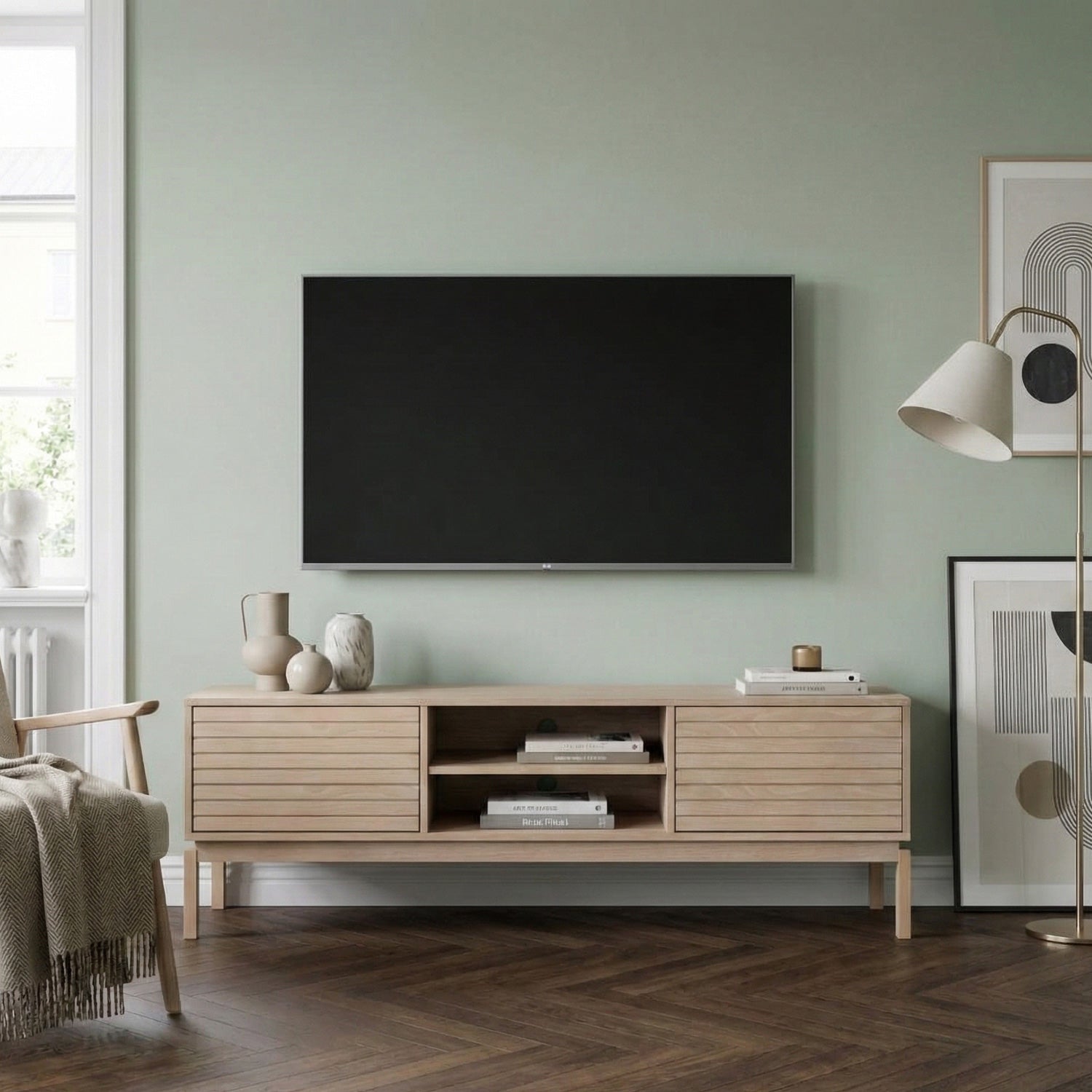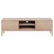 Med en ren och harmonisk design kommer denna vitpigmenterade oljade ek-tv-bänk inte att ta bort uppmärksamheten men kommer att vara ett fantastiskt tillskott med sina subtila detaljer. Kolla bara in lamellfronterna som ger en intressant detalj och optisk illusion. TV-bänken erbjuder gott om förvaringsutrymme bakom de 2 dörrarna eller på hyllorna.