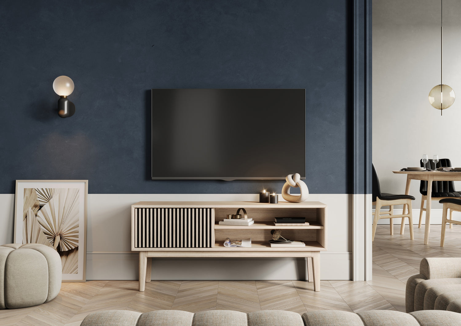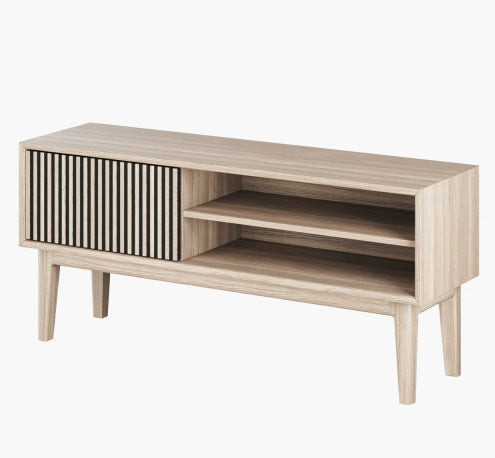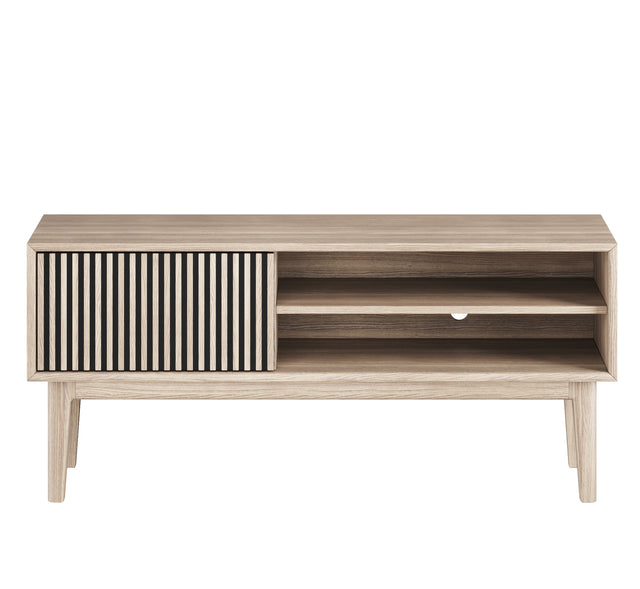 De två lamelldörrarna är utrustade med en smidig push-open-funktion som gör dem enkla att öppna utan synliga handtag, vilket ger ett rent och harmoniskt utseende. Bakom dörrarna finns gott om förvaring för elektronik, spel och andra tillbehör. Den breda hyllan i mitten är flyttbar och skapar flexibel plats för exempelvis spelkonsoler, högtalare eller mediaboxar. En öppning i bakstycket gör kabelhanteringen enkel och hjälper dig att hålla ordning bakom enheterna.