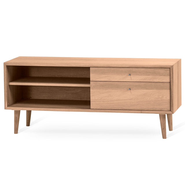 Scandi mediabänk B 118 D 39 H 50 i fanerad oljad ek. Två självstängande lådor och ett öppet fack.