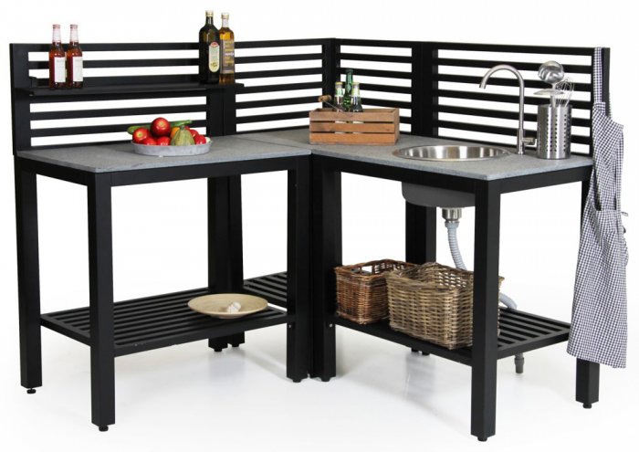 Här som bänk med vask där du enkelt kan koppla in vattenslangen till köket. Höjd upp till skivan är 90cm.