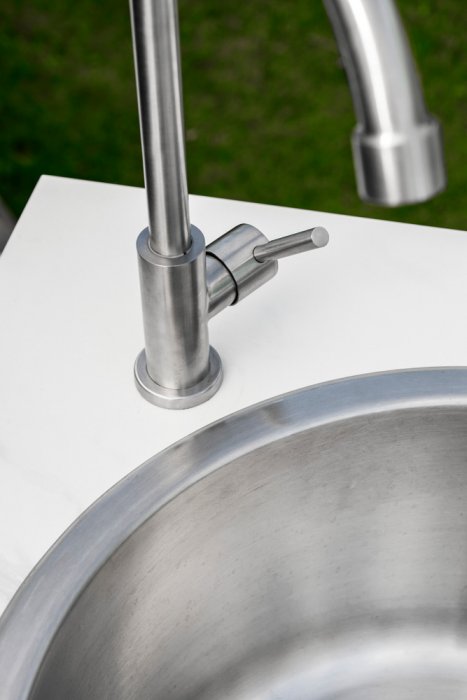 Figalia är ett exklusivt och elegant utekök från Brafab. Figalia har en stomme i massiv oljad teak. Toppenskivan är tillverkad i stenkomposit som finns i betong- och marmorimitation. Blandaren och andra metalldetaljer är tillverkad i rostfritt stål vilket ger en lyxig och fräsch känsla. Köket har en stor och generös arbetsyta och det finns smidiga hängare på sidan för grillredskap. Smidiga skjutdörrar undertill vilket ger gott om förvaring. Figalia har praktiskta hjul för att enkelt kunna flytta köket. Miljöbildern visar köket med den vita toppen.