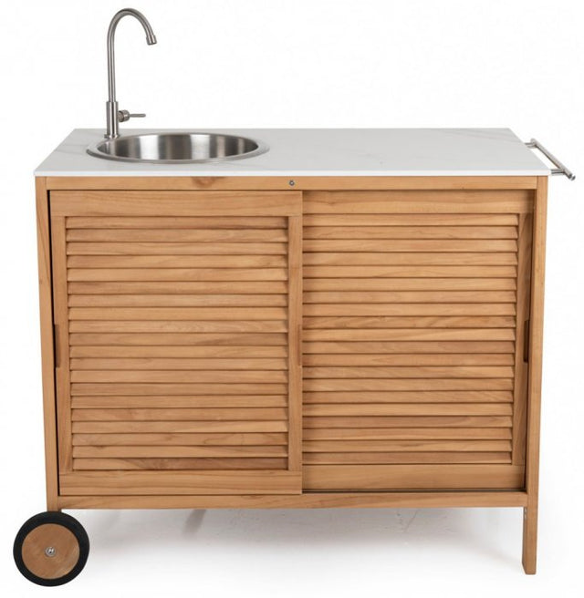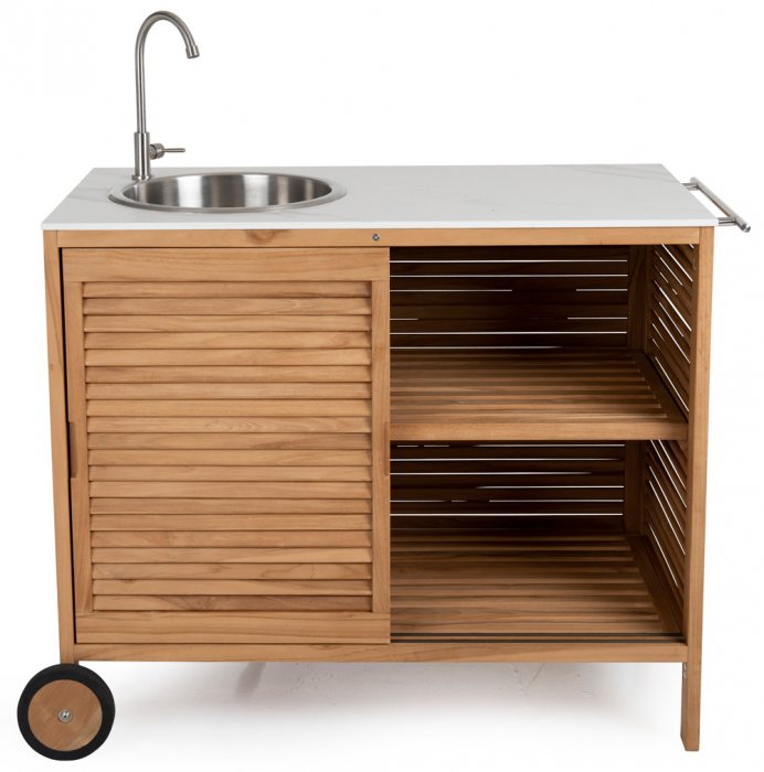Figalia är ett exklusivt och elegant utekök från Brafab. Figalia har en stomme i massiv oljad teak. Toppenskivan är tillverkad i stenkomposit som finns i betong- och marmorimitation. Blandaren och andra metalldetaljer är tillverkad i rostfritt stål vilket ger en lyxig och fräsch känsla. Köket har en stor och generös arbetsyta och det finns smidiga hängare på sidan för grillredskap. Smidiga skjutdörrar undertill vilket ger gott om förvaring. Figalia har praktiskta hjul för att enkelt kunna flytta köket.