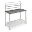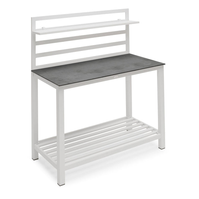 Vem vill inte laga mat under bar himmel? Sommarens måste och festens självklara medelpunkt är uteköket! Komplett arbetsbänk i vit aluminium, vit hylla samt gråmelerad bänkskiva.