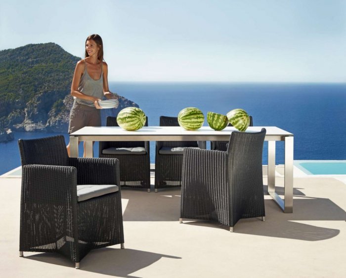 Diamond karmstol är en modern utestol med inovativ design. Denna underhållsfria karmstol finns i fyra färger, brun, vit, grafit och grå. Sunbrella Natté Dyna ingår.