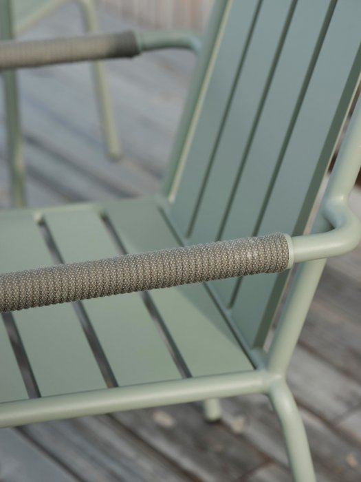 Breda ribbor i både rygg och sits gör denna karmstol till ett lika bekvämt som iögonfallande inslag vid bordet, här är det lätt att sitta länge. Den taktila detaljen med ett vackert lindat rep kring armstöden ger både värme, bekvämlighet och den där lilla extra designdetaljen som gör skillnad. Detaljerna matchar serien Lerberget och Nox men kommer även väl överens med alla möbler och bord den möter. Stapelbar och kommer i två färger.