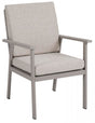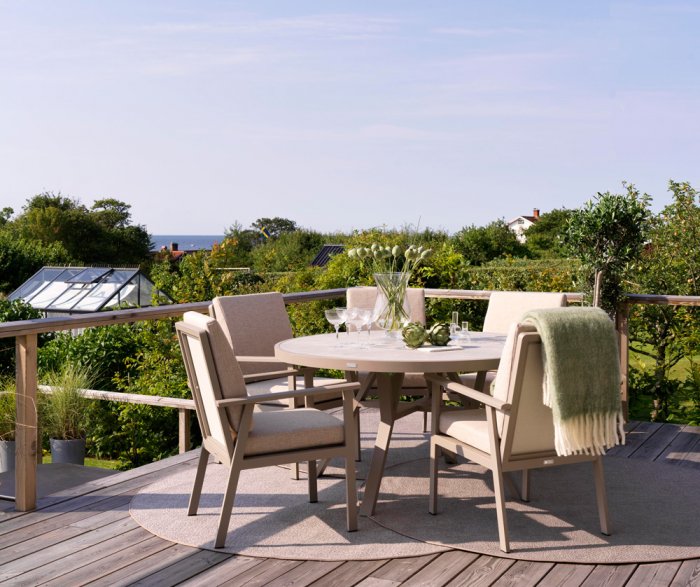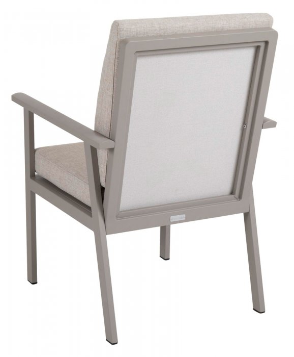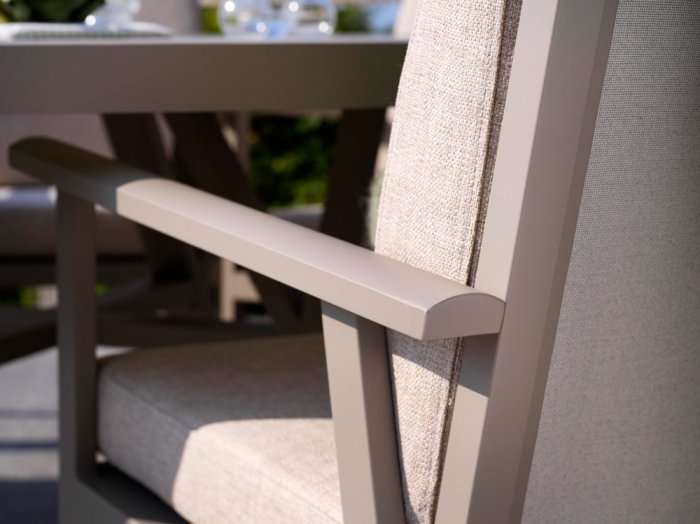 För extra komfort är ryggdynan formad och tillsammans med olefinklädda dynor med vattenavvisande beläggning skapas en bekväm och tålig sittmöbel. De lätt rundade armstöden bidrar till en ergonomisk och avslappnad sittupplevelse.