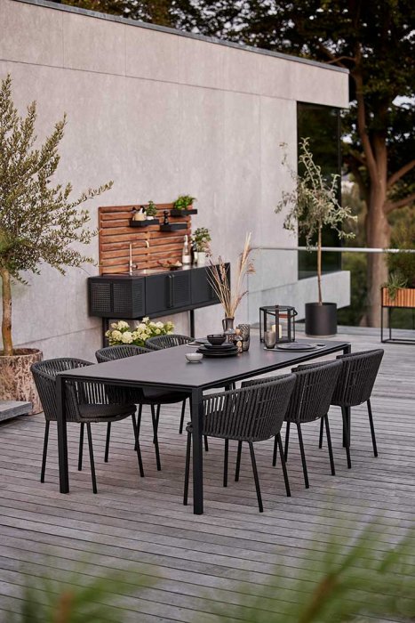 Moments från Cane-Line är en serie i modern skandinavisk stil skapad av designduon Foersom & Hiort-Lorenzen MDD. Möblerna är tillverkade i Cane-Line Soft-Rope och SoftTouch QuickDry kuddar. Det mesta av vattnet rinner av kuddarna vid ev regn. Det som ändå blir kvar torkar på ca en timme. En snygg och underhållsfri serie trädgårdsmöbler som passar lika bra i villaträdgården som på terassen inne i stan. Här som modern och elegant loungefåtölj.