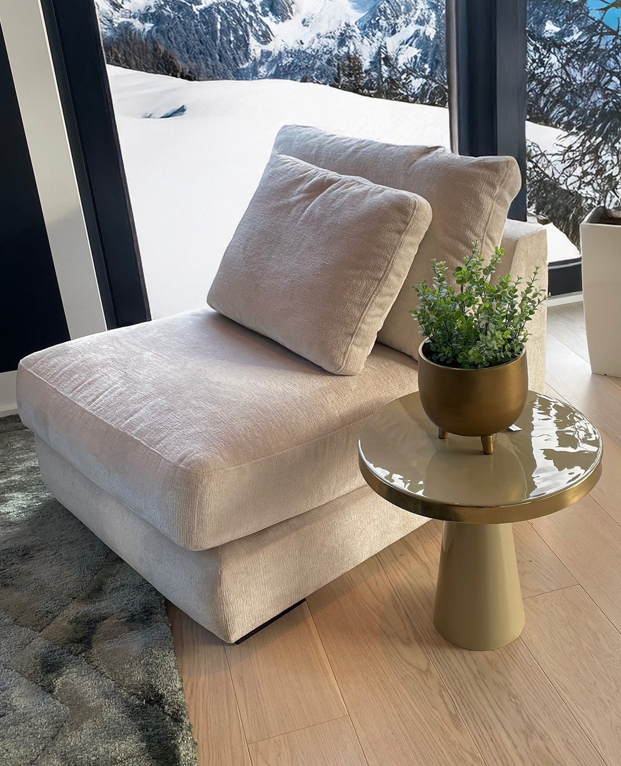 Sittplymåerna är uppbyggda av 30 kg kallskum med en topp av silikonbollar. Det ger en mjuk och inbjudande känsla samtidigt som dynan behåller formen över tid. Stommen är tillverkad i massivt trä och plywood och förstärkt med ett metallfjädersystem för stabilitet och lång hållbarhet. Upptäck hela Grim-serien här!