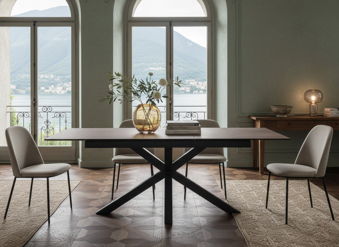 Verdun matbord kombinerar modern design med robust karaktär och blir en stilfull mittpunkt i matsalen. Den värme- och reptåliga keramiska bordsskivan har ett levande rostbrunt utseende som ger rummet en varm och inbjudande känsla.