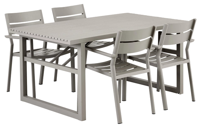 I matgruppen ingår ett Vevi matbord 160x90 cm och 4st Delia Karmstolar i khaki.