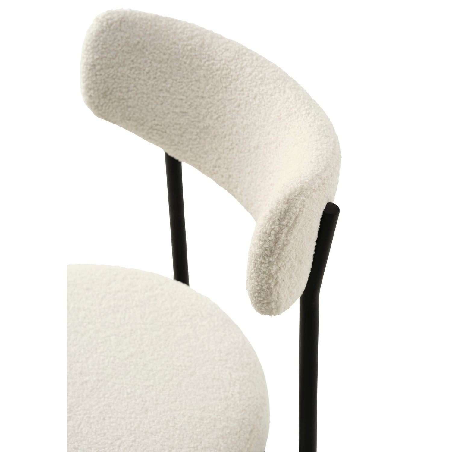 Linea i vit teddy ger matplatsen en mjuk, ombonad känsla med modern edge. Den runda sitsen och det svagt böjda ryggstödet ger skön avlastning, medan de slanka, svarta metallbenen ger stabilitet och en lätt, grafisk siluett. Lätt att placera runt både runda och rektangulära bord, lika fin solo som i set.