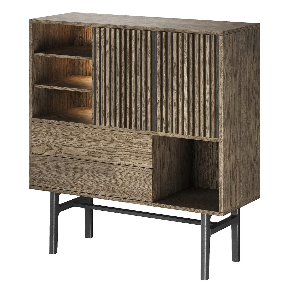Casø 230 högskåp är en fantastiskt praktisk möbel med många förvaringsmöjligheter. De två dörrarna på den övre halvan döljer en justerbar trähylla. Dörrarna finns både som spjälldörrar och fiskbensdörrar. Den nedre halvan består av två stora lådor och ett öppet utrymme. Båda lådorna är utrustade med push-open. Ovanför lådorna finns ännu ett öppet utrymme med två trähyllor. Båda hyllorna döljer förborrningar som möjliggör senare installation av Ljusklämmor.