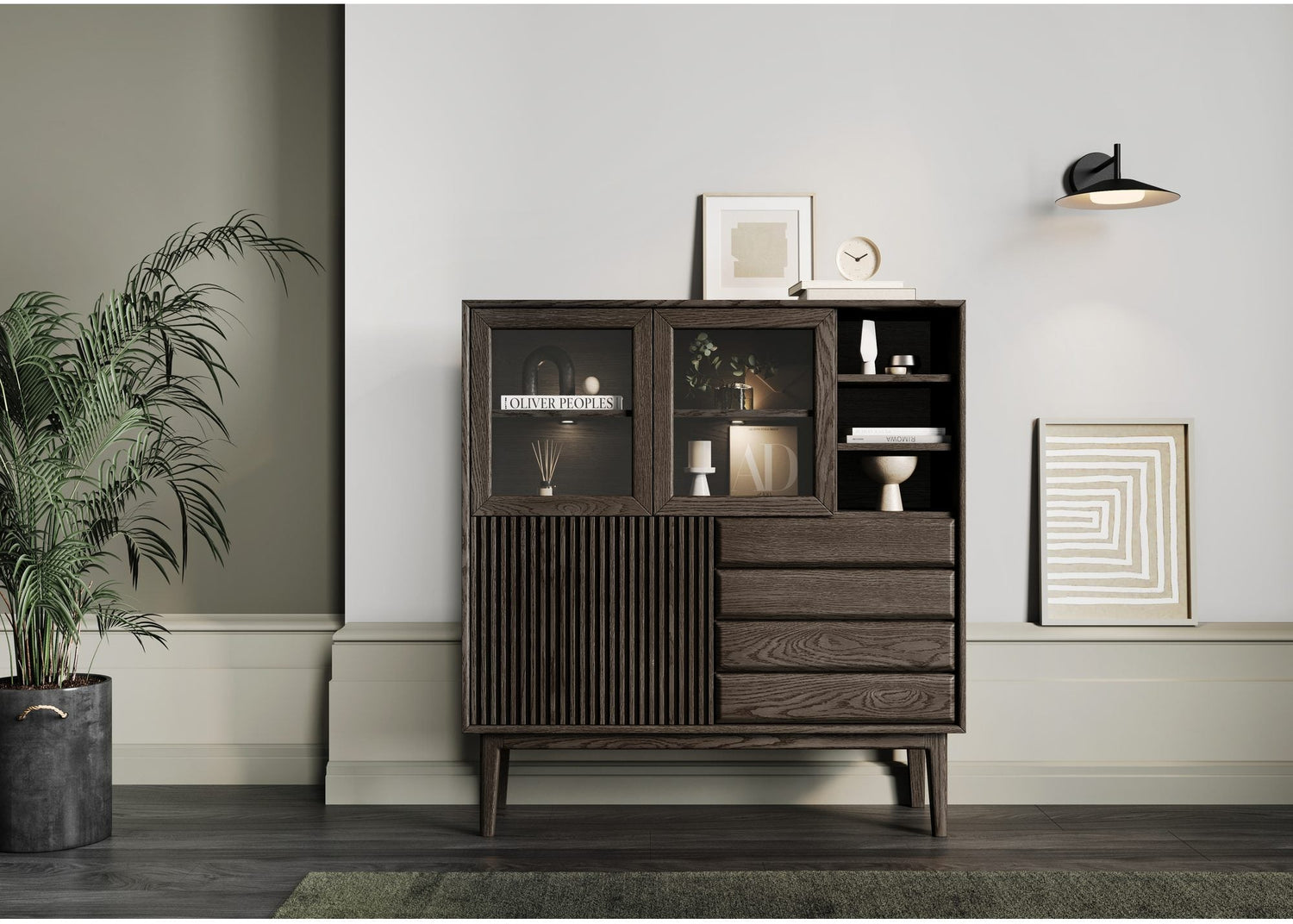 Casø Broholm högskåp erbjuder inte bara stilfull förvaring utan kan även anpassas ytterligare genom att lägga till Belysning på de synliga hyllorna. Detta alternativ ger möbeln en exklusiv touch och framhäver dina dekorativa föremål på hyllorna samtidigt som det skapar en mysig atmosfär i rummet.