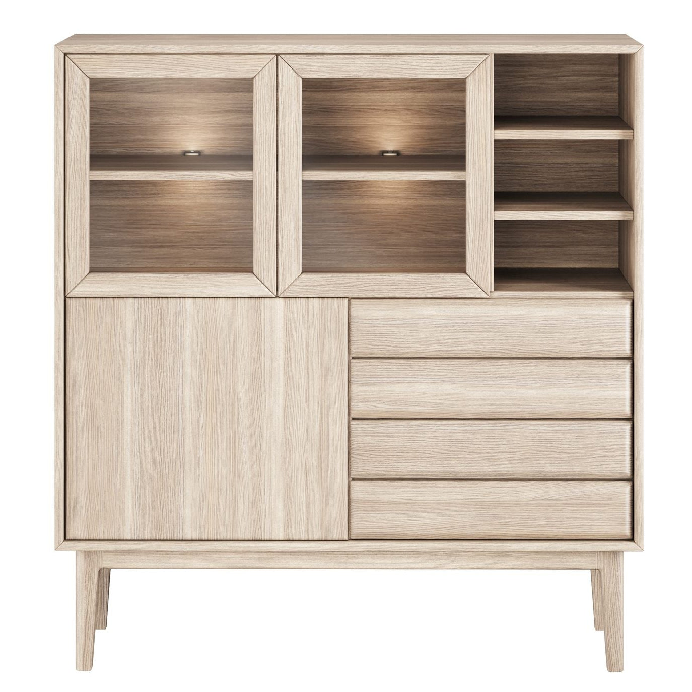 Massivt ek-högskåp med robust konstruktion och en modern, handtagslös look. Alla dörrar och lådor är utrustade med push-open funktion, vilket säkerställer en ren och enhetlig design. Bakom den massiva trädörren finns en intern trähylla, idealisk för att förvara saker du vill hålla undan från syn. Alla hyllor är avtagbara för flexibel organisering. Möblerna är förberedda för integrerad Belysning, som kan köpas för att ytterligare framhäva detaljerna. Denna modell finns också med en lamelldörr.