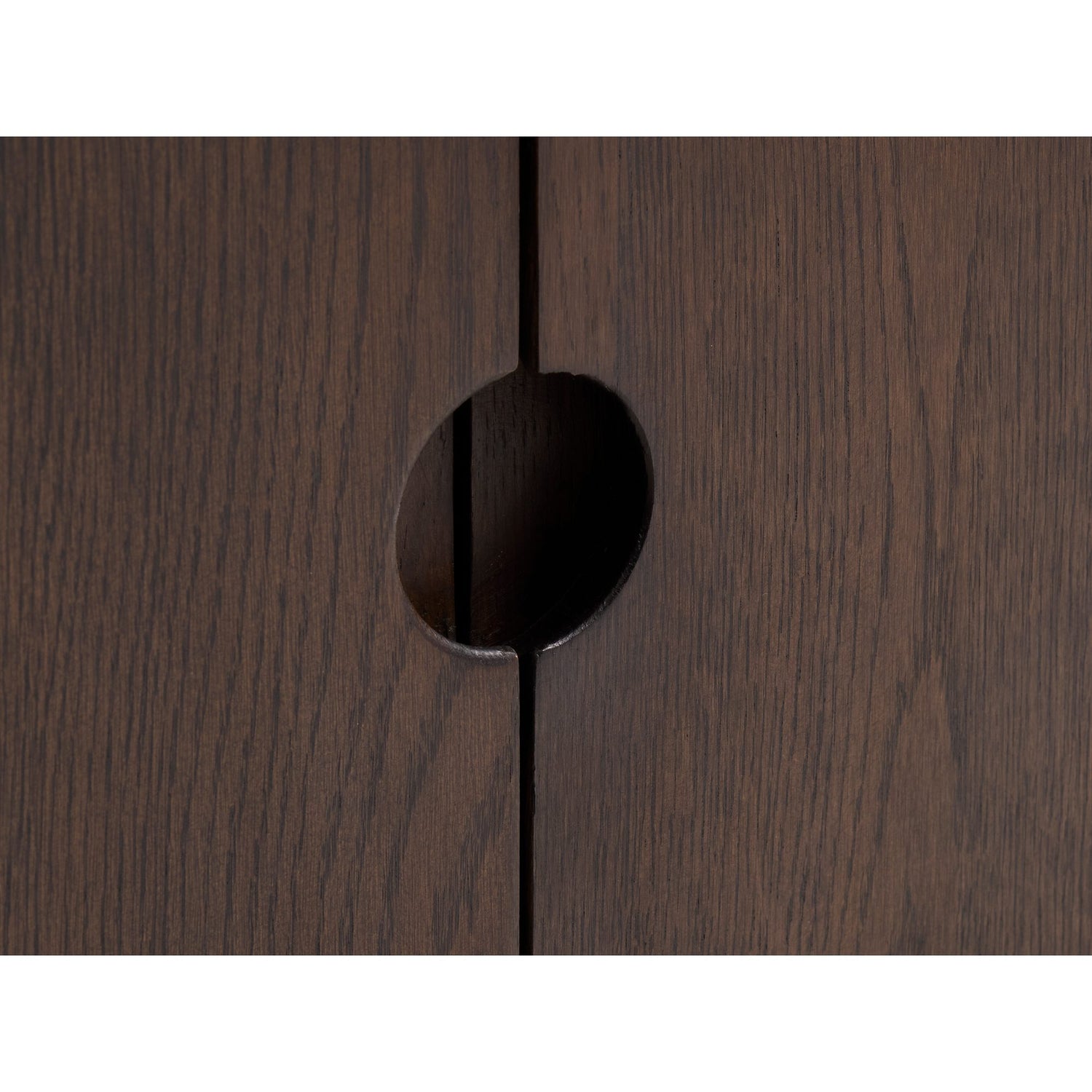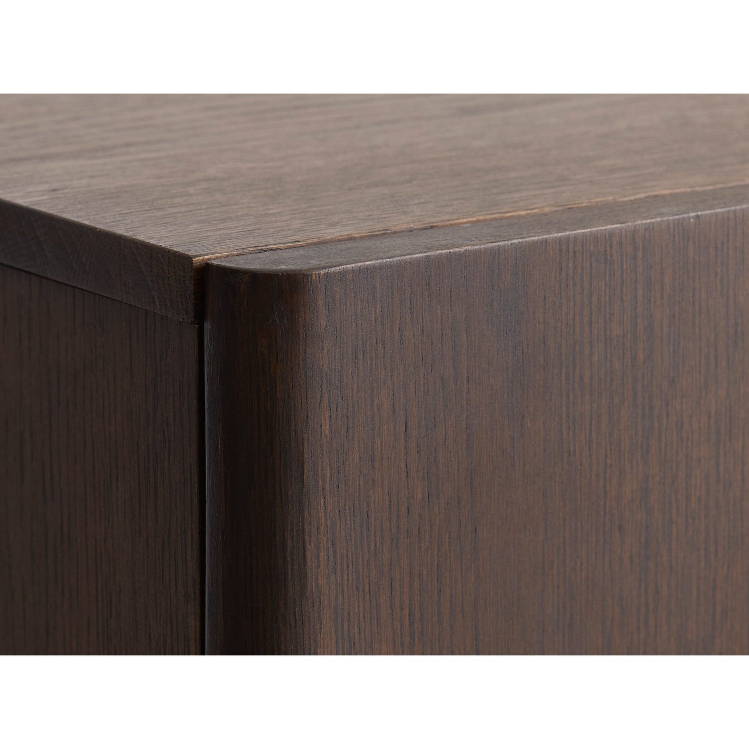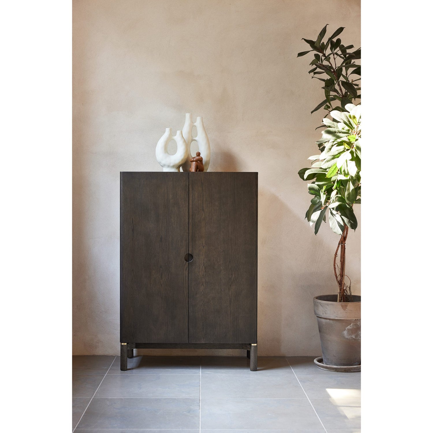 Grant är skåpet som förenar stram skandinavisk form med lyxiga detaljer. Den mörka espressofinishen lyfter ekens ådring och ger ett sobert uttryck, medan de runda benen i massiv ek med diskreta mässingsdetaljer adderar en elegant accent. Bakom de rena dörrarna med urfrästa, runda grepplösningar döljer sig rymliga hyllplan, perfekt för porslin, glas, textilier eller hemmakontorets prylar. En tidlös förvaringsfavorit som håller ordning med stil.