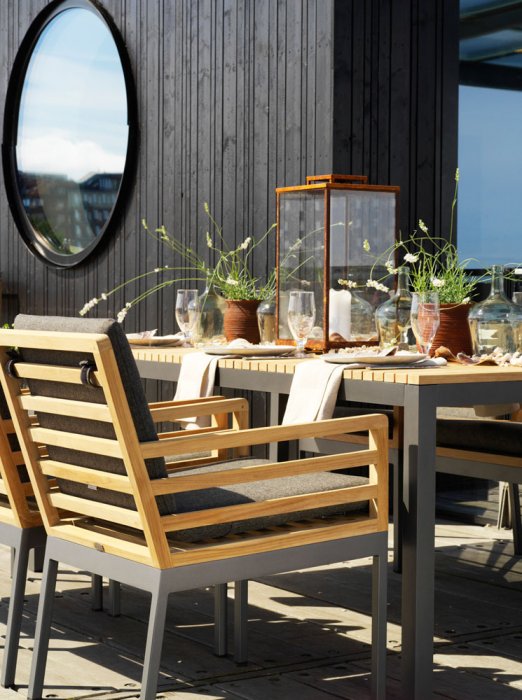 Zalongo är en mycket elegant matbord i oljad kvalitetsteak med ett underrede i antracitlackad aluminium. Toppskivan har snyggt designade smala ribbor i massiv teak som ger ett snyggt och exklusivt intryck. Tack vare de smala och nätta benen så får du enkelt plats med tre stycken stolar. Den är tillverkad av Brafab.