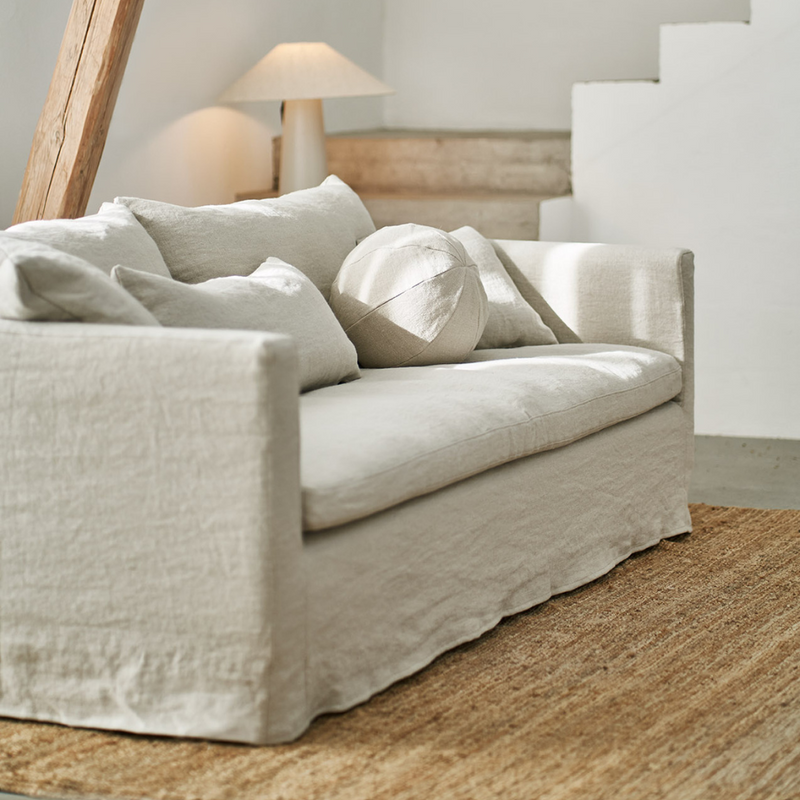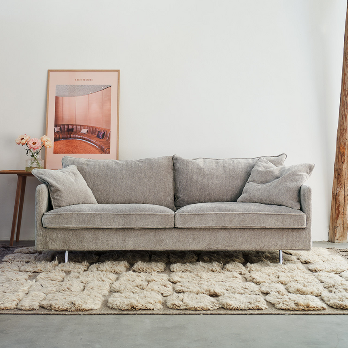 Mjuk, rymlig och charmig soffa med sittkuddar av kallskum och kanalsydd duntopp på båda sidor - perfekt för den som inte vill puffa! Bara att vända på kuddarna istället.