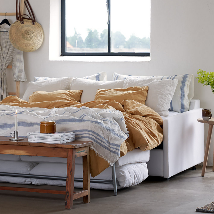 Praktisk soffa med utfällbar sängfunktion. Perfekt för gästrum eller små utrymmen där extra sovplats behövs utan att kompromissa med stil och komfort.