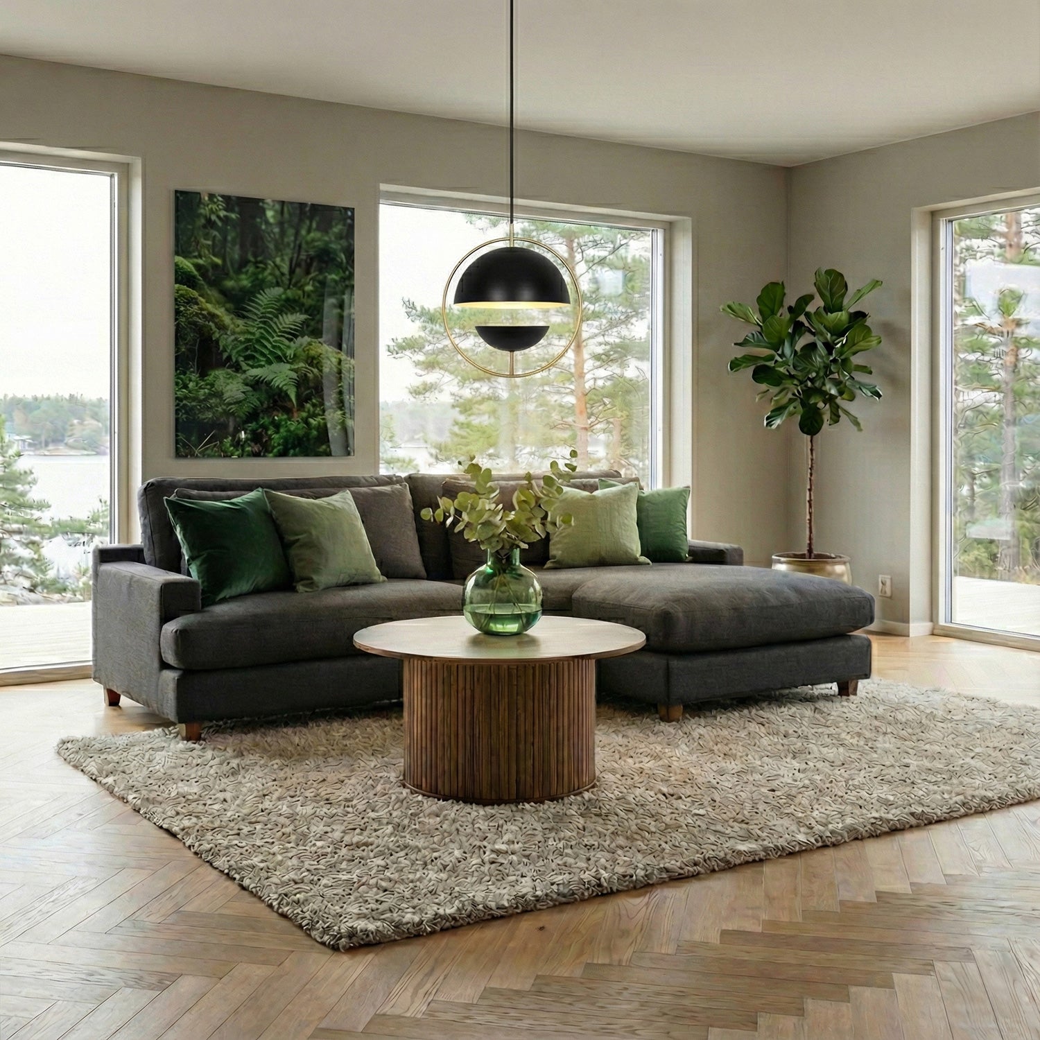 Runt soffbord med slät topp och räfflad, cylindrisk bas som ger rummet ett lugnt men uttrycksfullt fokus. Den rökta tonen tillför värme och djup, medan synliga ytor är ekfaner i rökt utförande – jämn yta med äkta träkänsla och mindre underhåll än massiv ek. Den runda formen skapar naturligt flöde och gör det enkelt att möblera runt soffgruppen.
