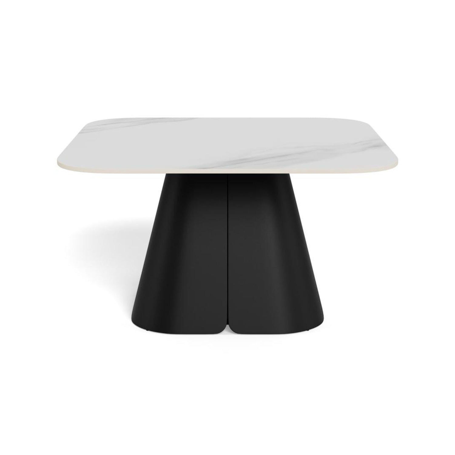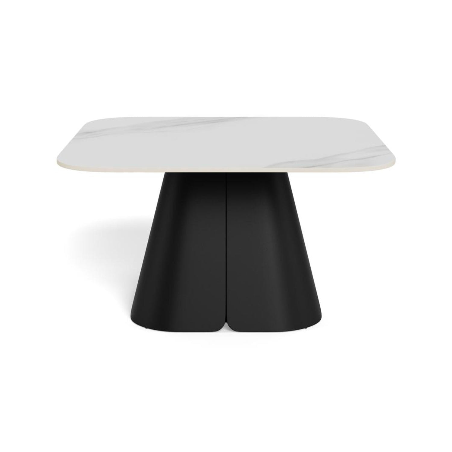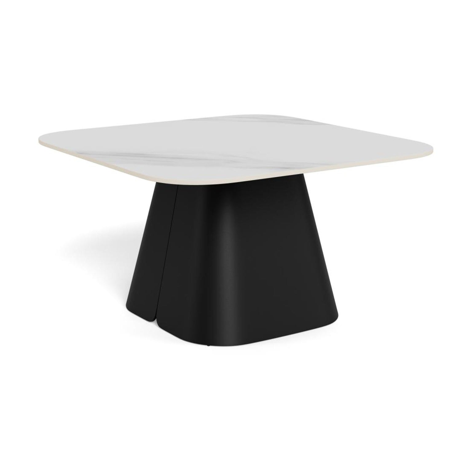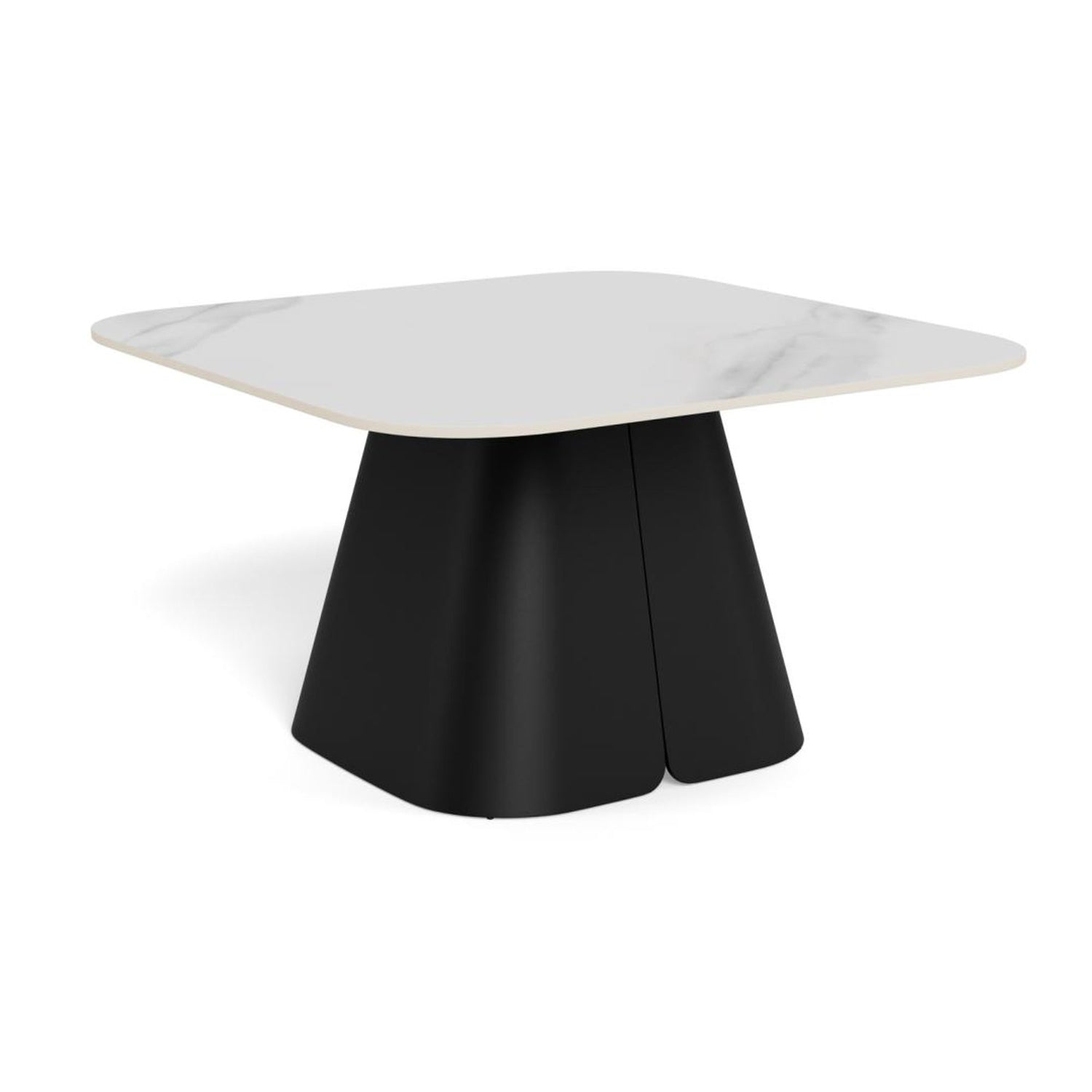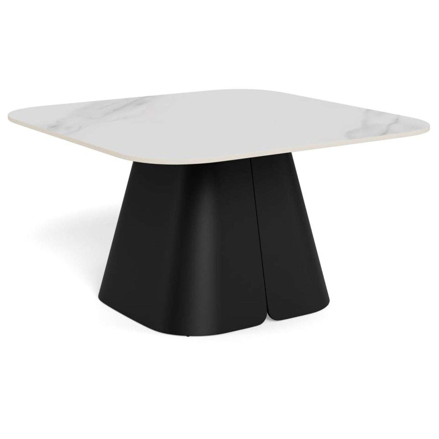 Byggd på kontrast har detta soffbord en fyrkantig vit topp med rundade hörn, som sitter på en svart pelare. Den smala toppen är gjord av keramik - ett värme- och reptåligt material, prytt med subtila ådringar. Med en robust pelarbas av svart stål har bordet en solid grund. Det är en pjäs för dem som uppskattar djärv, uttrycksfull design.