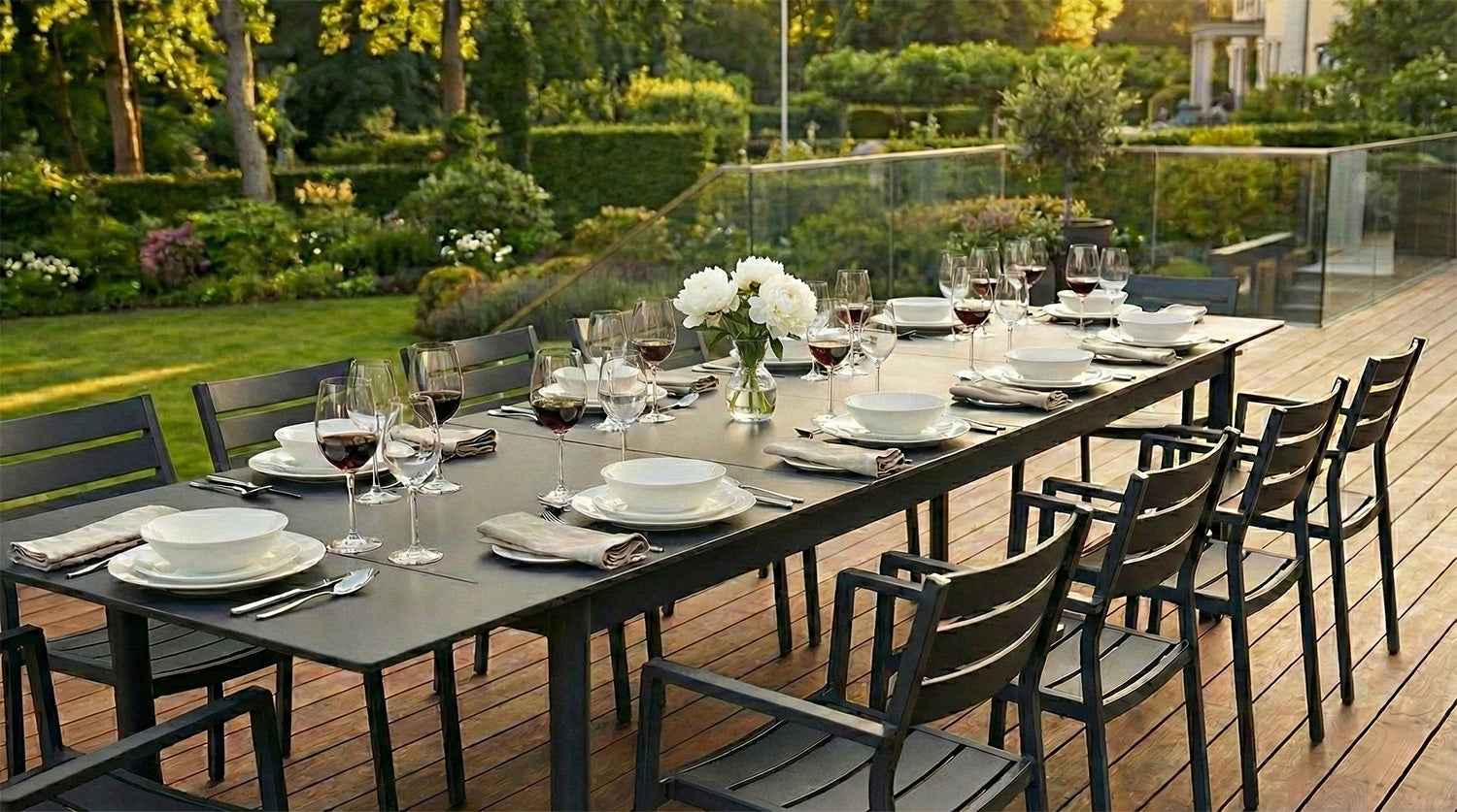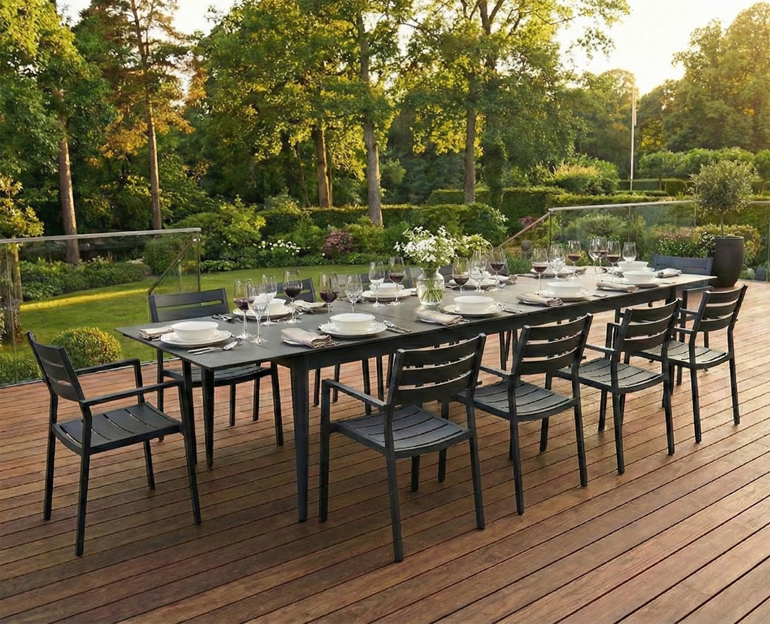 Anzio Matbord XL i svart är ett extra rymligt matbord för utomhusbruk som passar perfekt när många ska samlas runt samma bord. Med en generös bredd på 110 cm och en längd som kan justeras från 266 till hela 396 cm finns det gott om plats för både vardag och större tillställningar.