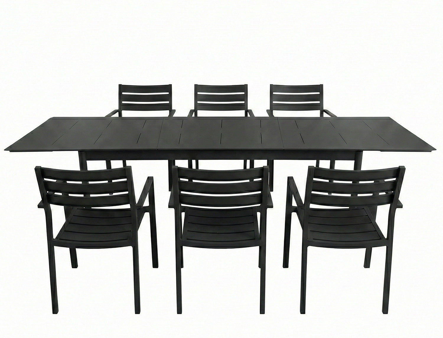 Anzio matgrupp i svart är en stilren och funktionell lösning för dig som vill skapa en elegant matplats utomhus. Kombinationen av ett flexibelt matbord och bekväma karmstolar gör gruppen väl anpassad för både vardagsbruk och större sammankomster under utesäsongen.