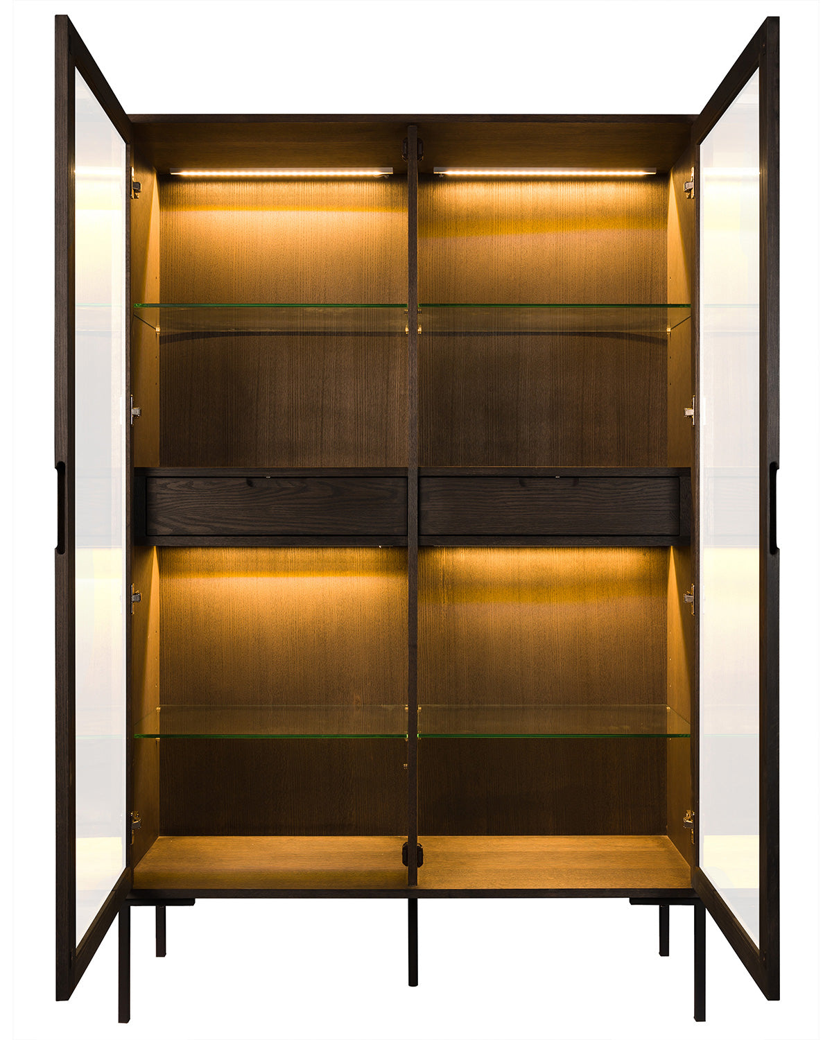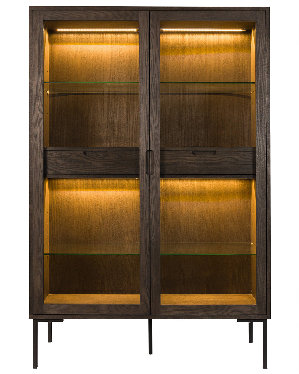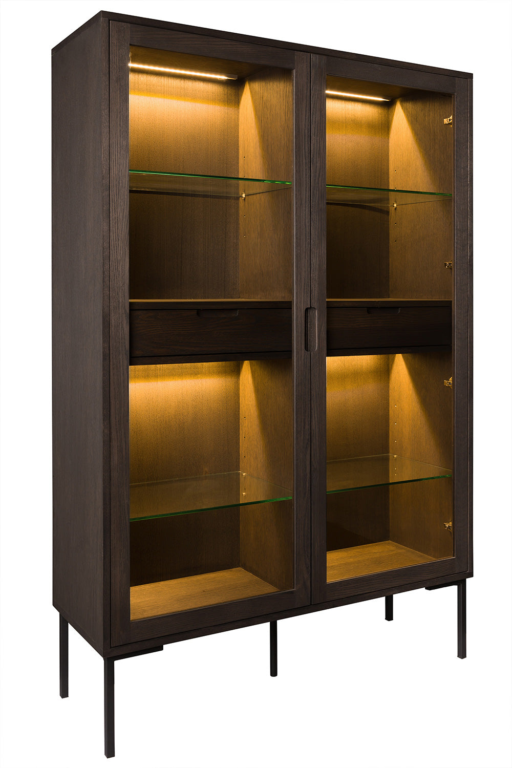 Belfort är en modern serie med både förvaring och matbord från Nordic Furniture Group. Vitrinskåpet är tillverkad i en blandning av både fanér och massiv ek i en snygg mörkbrun finish. Stommen är fanerad och lådorna är massiva. Belfort har fyra reglerbara glashyllplan och två lådor i trä, led belysning kommer inkluderat. Belfort kommer monterad.