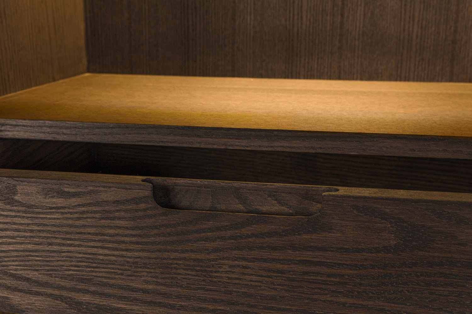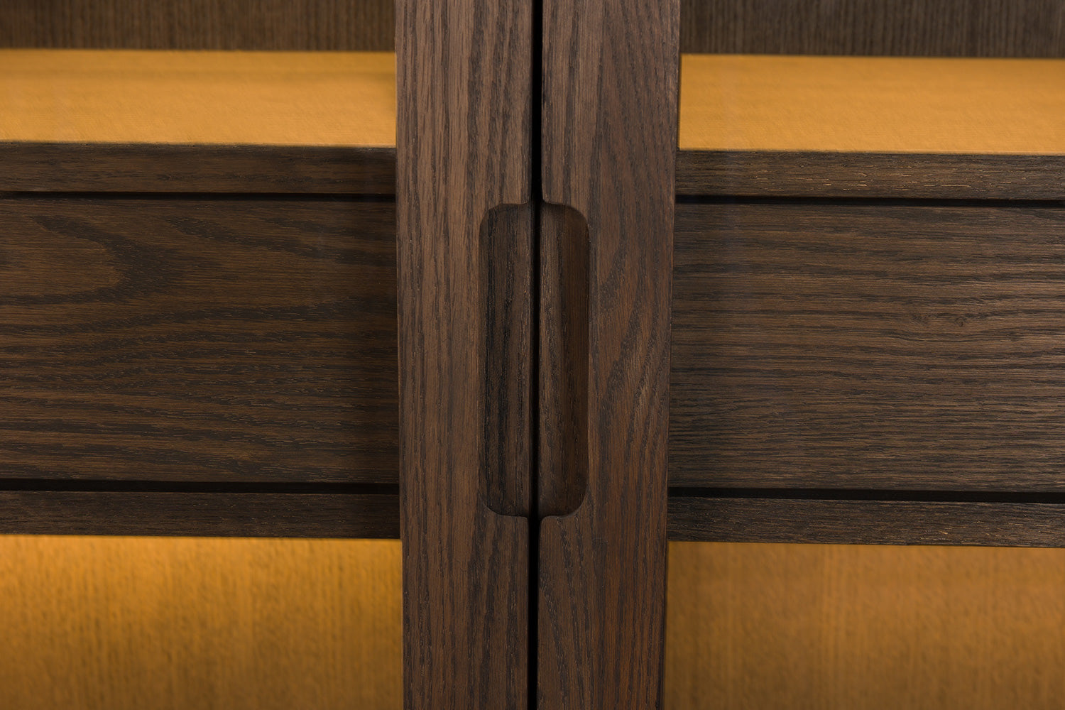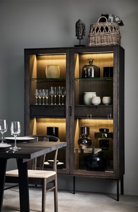 Belfort är en modern serie med både förvaring och matbord från Nordic Furniture Group. Vitrinskåpet är tillverkad i en blandning av både fanér och massiv ek i en snygg mörkbrun finish. Stommen är fanerad och lådorna är massiva. Belfort har fyra reglerbara glashyllplan och två lådor i trä, led belysning kommer inkluderat. Belfort kommer monterad.