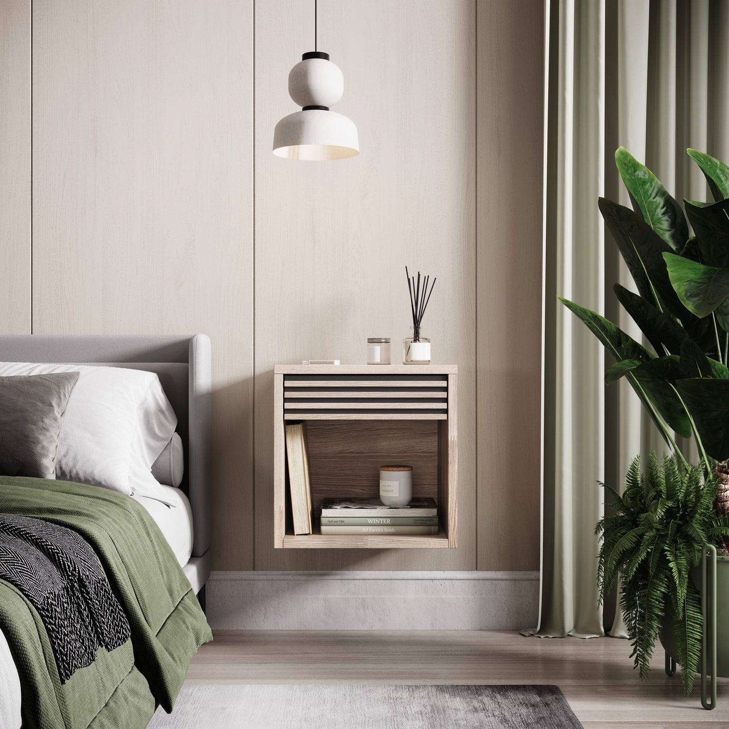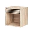 Nattduksbordet har en liten låda med en ribbad front. Nedanför finns ett öppet utrymme med gott om plats för de saker du vill ha närmast på natten.