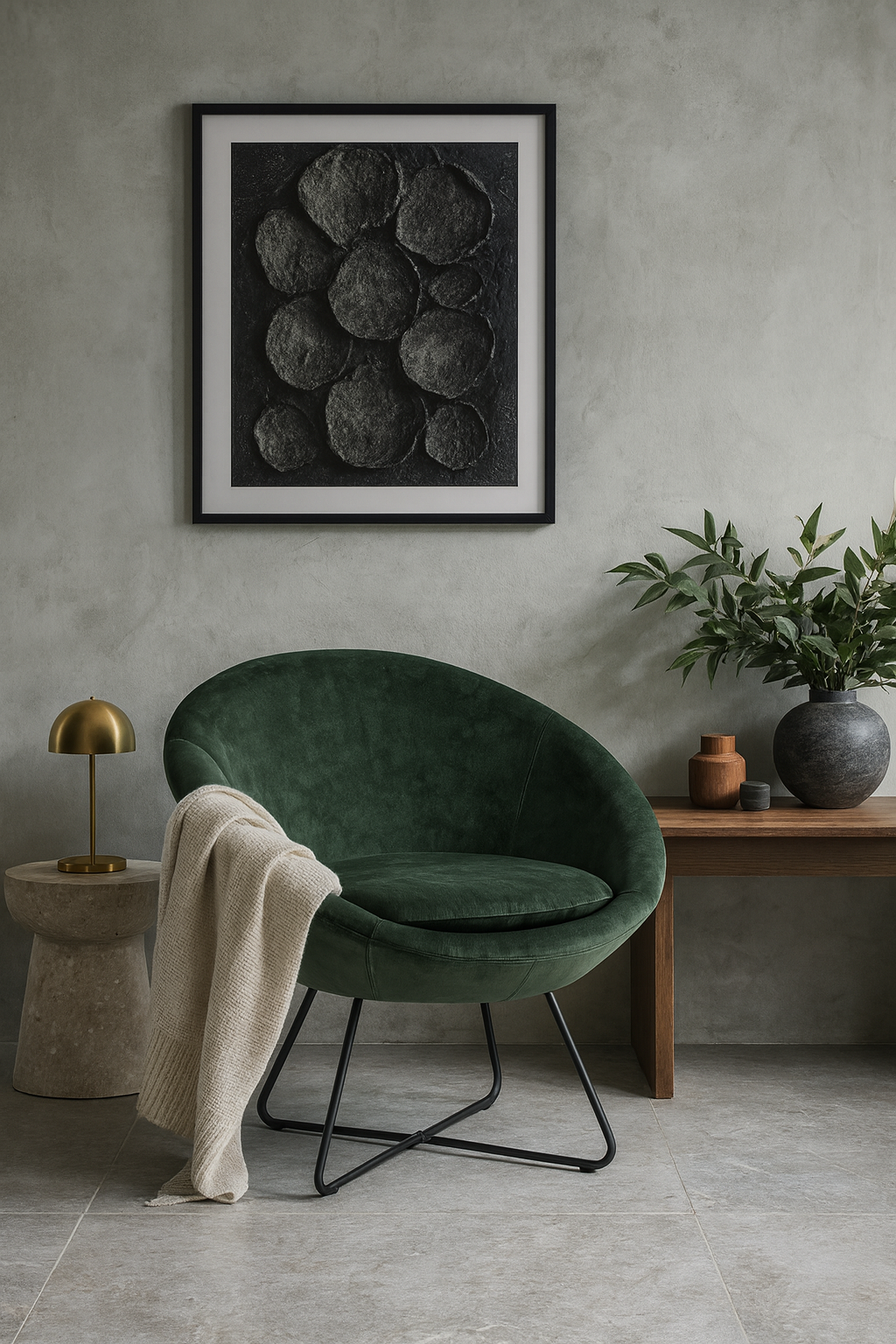 Denna organiskt formade vilstol ger en sofistikerad loungestil till ditt vardagsrum. Den pulverlackerade metallbasen i svart kompletterar den mjuka, klädda sitsen för optimal komfort.