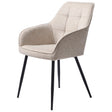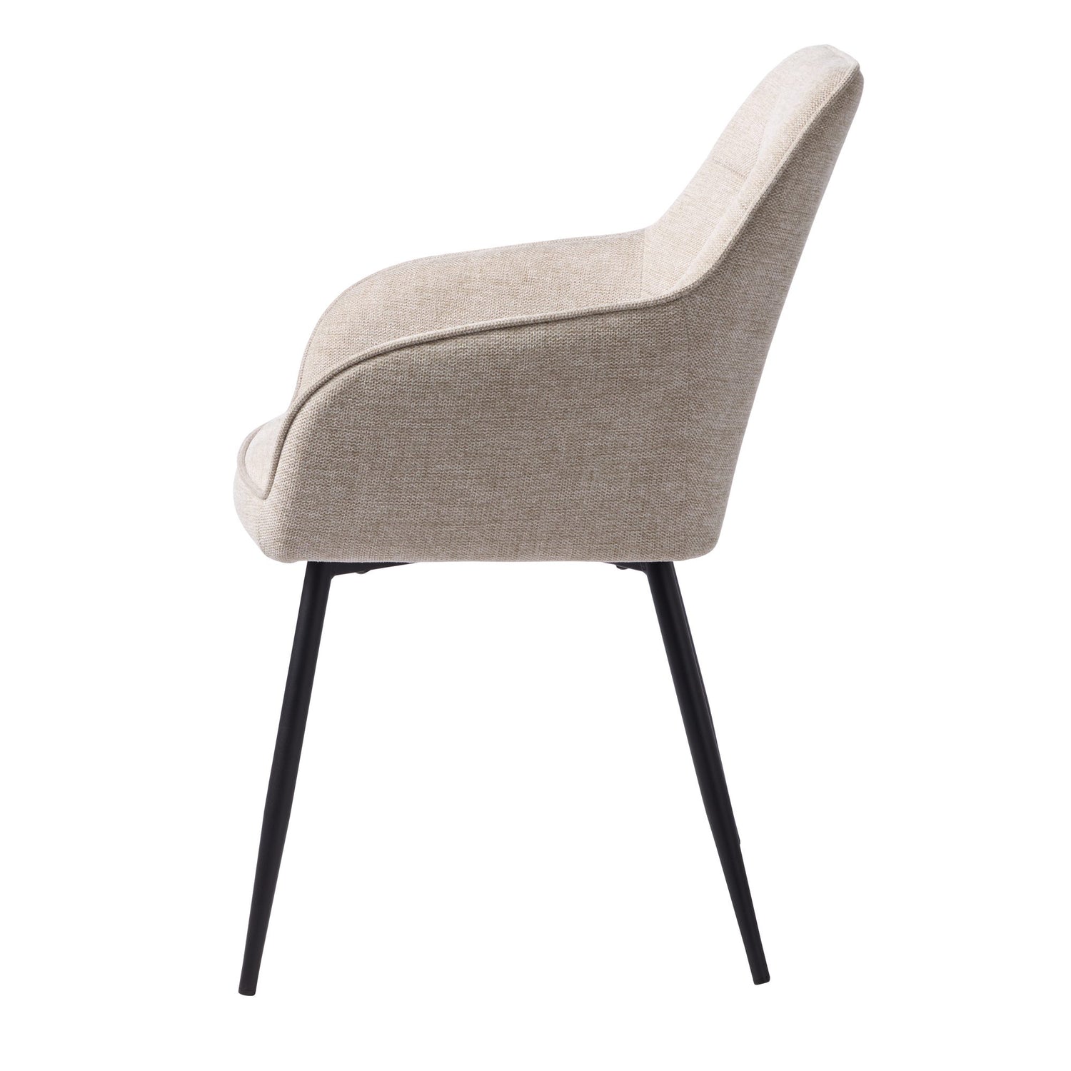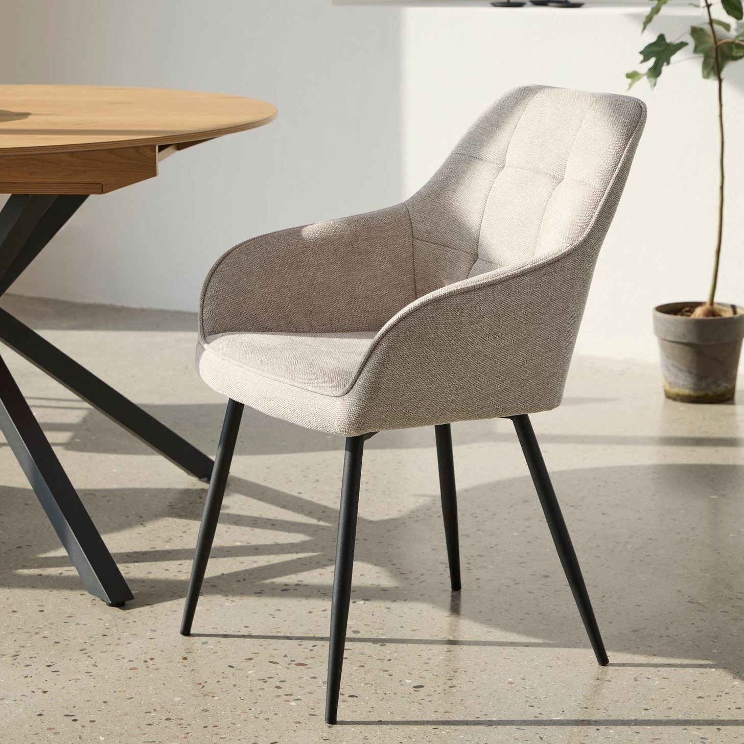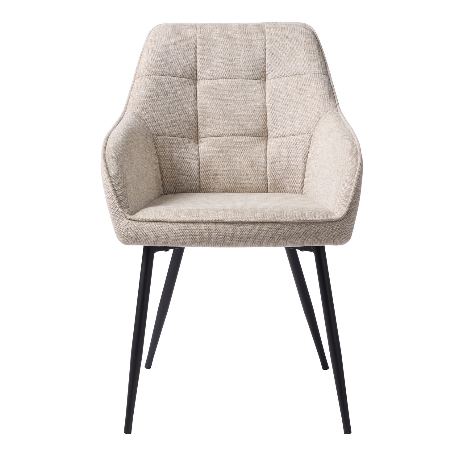 Cubo i sandfärgat tyg ger en ljus och varm känsla runt bordet. Sits och rygg är behagligt stoppade och den mjukt omslutande formen gör stolen bekväm även vid långa sittningar. Den svarta metallbasen skapar en fin kontrast och ett luftigt uttryck.