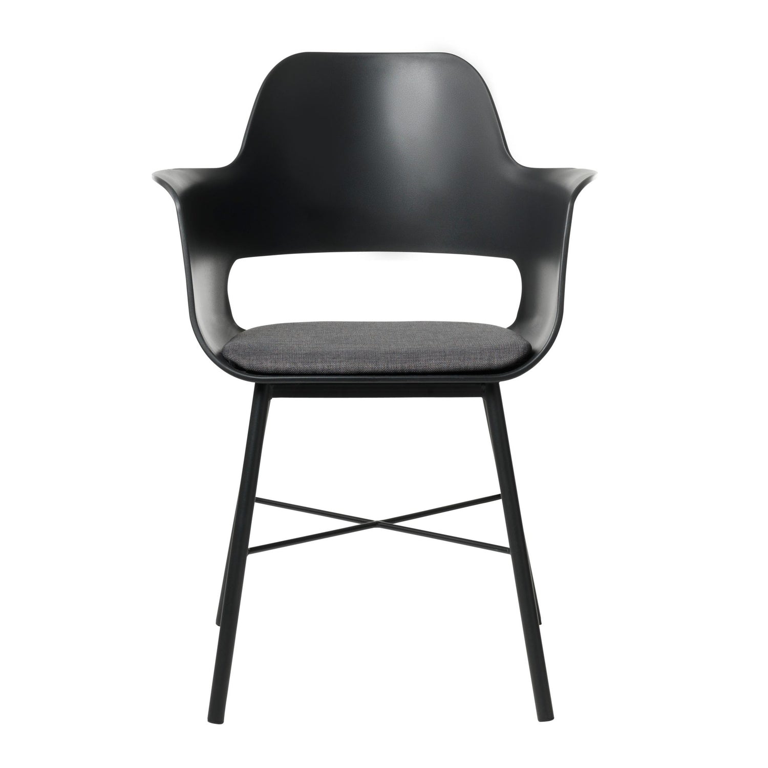 Diamante i svart ger ett grafiskt, monokromt uttryck som lyfter moderna interiörer. Den omslutande skalformen och de integrerade armstöden ger stöd och ro, medan den vadderade sitsen gör stolen riktigt bekväm över tid. Det slanka svarta metallunderredet ger stabilitet utan att kännas tungt, en stilren favorit för både hem och kontor.